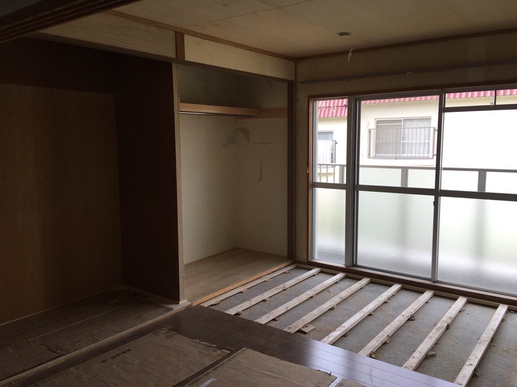 八尾市 リフォーム 内装工事 和室から洋室 2018/08/31 【工事内容】和室8帖を洋室へ。ラミ天井をクロス、聚楽壁をクロス、畳をフローリング、押入れをクローゼット 【使用商品】パナソニック フィットフロアー ベリティス収納折れ戸 【工期】3日 【施工費】¥400,000 施工中①床下地 施工中②天井下地 施工後① 施工後② 東大阪市、八尾市、柏原市、藤井寺市、羽曳野市、奈良で内装工事のことなら住まいるリフォームへ!!