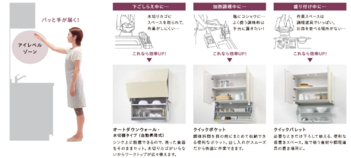 吊戸棚(ウォールユニット)の間口は、キッチン全体からレンジフードの間口を引いたサイズです。 間口に合わせて、キャビネットの高さや扉のタイプ、欲しい機能などをチェックして組み合わせます。アイレベル(調理の作業中、自然と目に入ってすぐ手が届く場所)機能付きを選ぶ場合は、調理スペース上は調味料などの置き場所に、シンク上は仮置きや水切りのスペースにすると便利です。