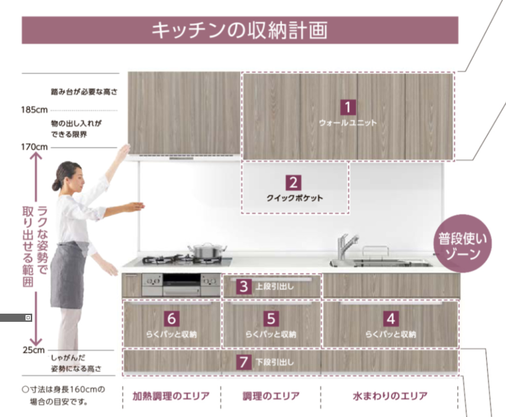 吊戸棚が無い方がスッキリしていて良いとお考えの場合も、収納量を考えると背面にカップボードなどを設置をされる場合が多いようです。キッチン入替え時に、吊戸棚を付けるのであれば、隅々まで上手に収納をして活用したいものですね。そこで大切なのが、吊戸棚の高さとご自身の身長のバランスです。吊戸棚の基本的な高さは、どのメーカーもほぼ共通で、奥行のサイズは30cm強、一般的な高さは50cm、60 cm、70 cmの3種類から選ぶことができるパターンが多いです。