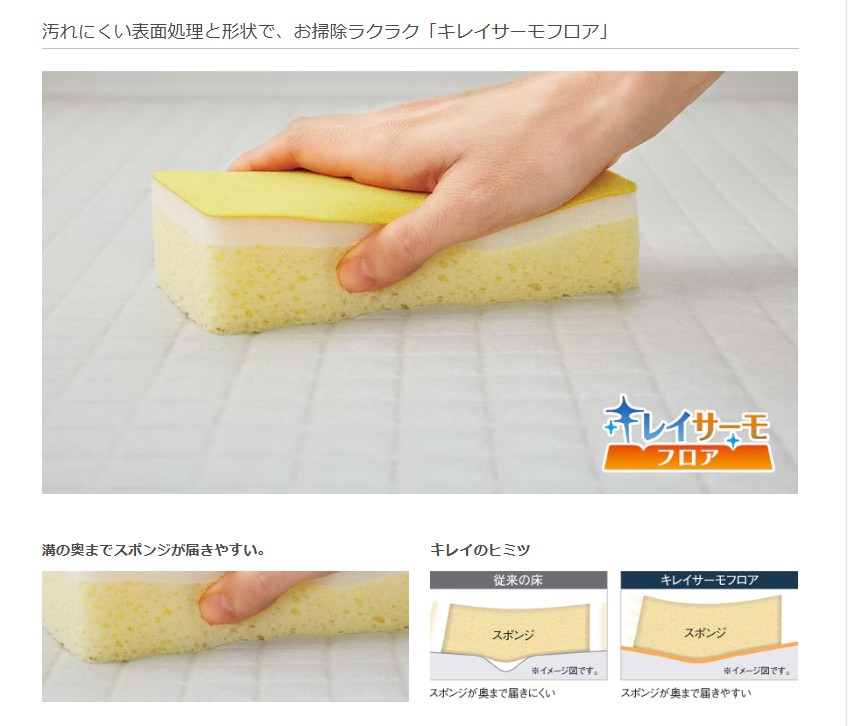 LIXILのシステムバスは「らくらくキレイ」が特長。その中のひとつ『キレイサーモフロア』はお掃除がしやすいことを重視される方ににおススメです。