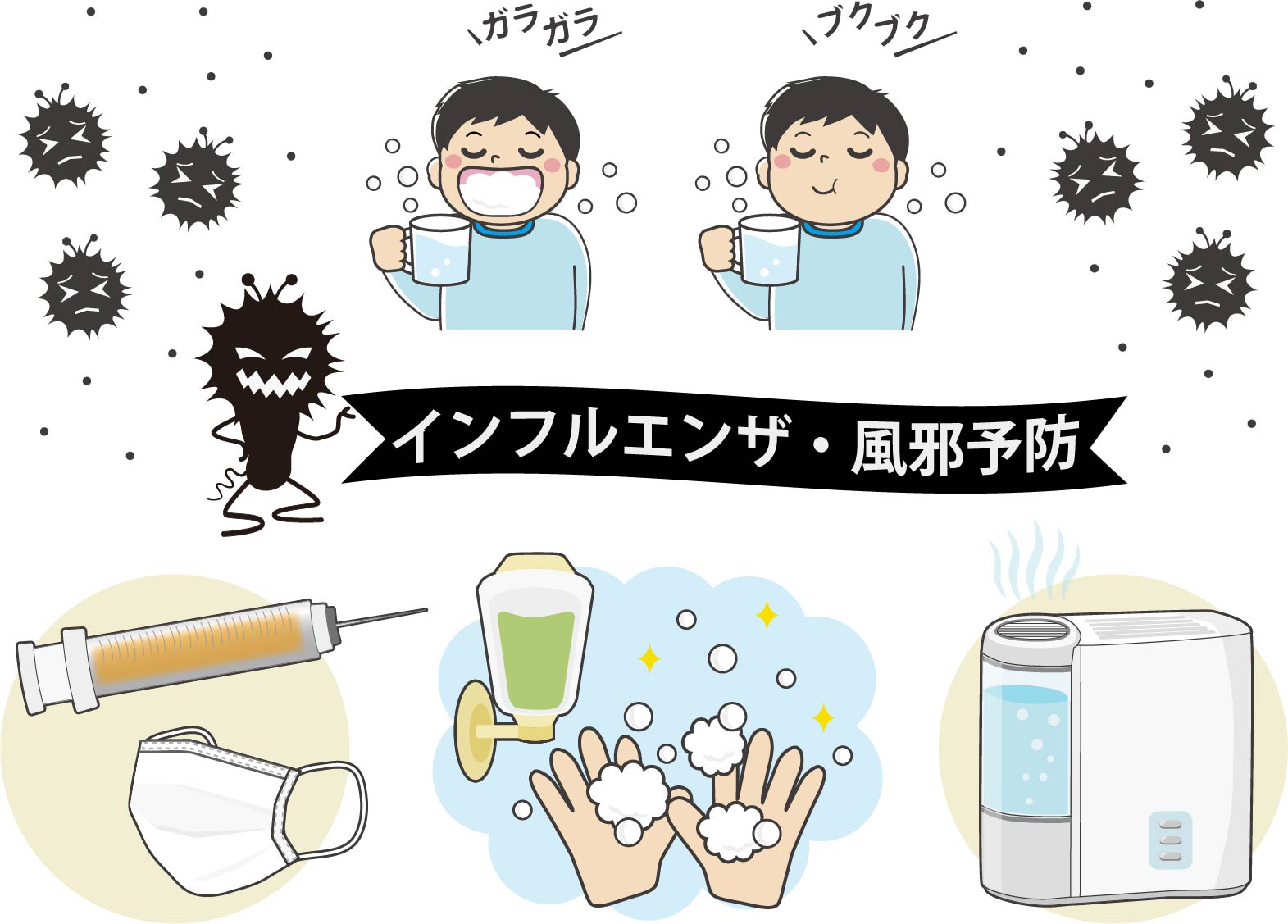 インフルエンザ予防は、まずウイルスに感染しないことが大切です。予防の基本はマスクの着用と外出後の手洗い・うがいを正しく行うことです。また、ウイルスは乾燥を好むので、室内の湿度は加湿器などで適切に保つことが大切です。湿度を50~60%に保つことで、インフルエンザウイルスの活動を抑えることはもちろん、肌や喉の乾燥を防ぐ、ダニやカビの繁殖を抑制するなど、健康維持と快適な生活環境のために重要です。加湿器や除湿機、換気などを活用したり、部屋干しをすると、洗濯物から出る水分で湿度を上げれます。清潔なタオルを干すだけでも効果があります。