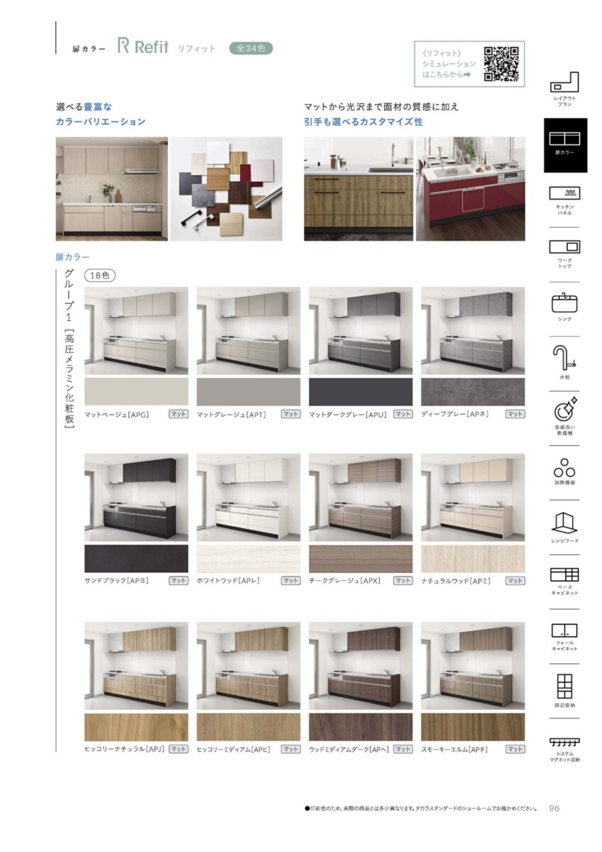タカラスタンダードのリフィットは、もう一つの特徴は、キャビネットや吊戸棚で間口1cm刻みの仕上げに対応。スキマを埋める造作材やフィラーなどの無駄なスペースを省けるので、収納スペースを広げ、美しいキッチンにリフォームすることができます。扉カラーは全34色の中からお好みのものをお選び頂けます。