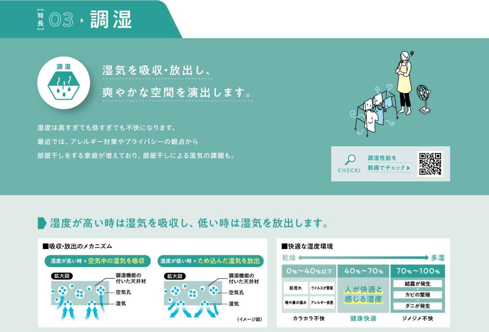 湿度が高い時は湿気を吸収し、乾燥している時は湿気を放出。エコカラットプラスは、すぐれた調湿性能で快適な湿度を保とうとします。その効果は珪藻土の約6倍、調湿壁紙の25倍以上もあるんです。だから結露を抑え、カビやダニの繁殖の抑制も期待できる。洗濯物の部屋干しにも、おすすめです。