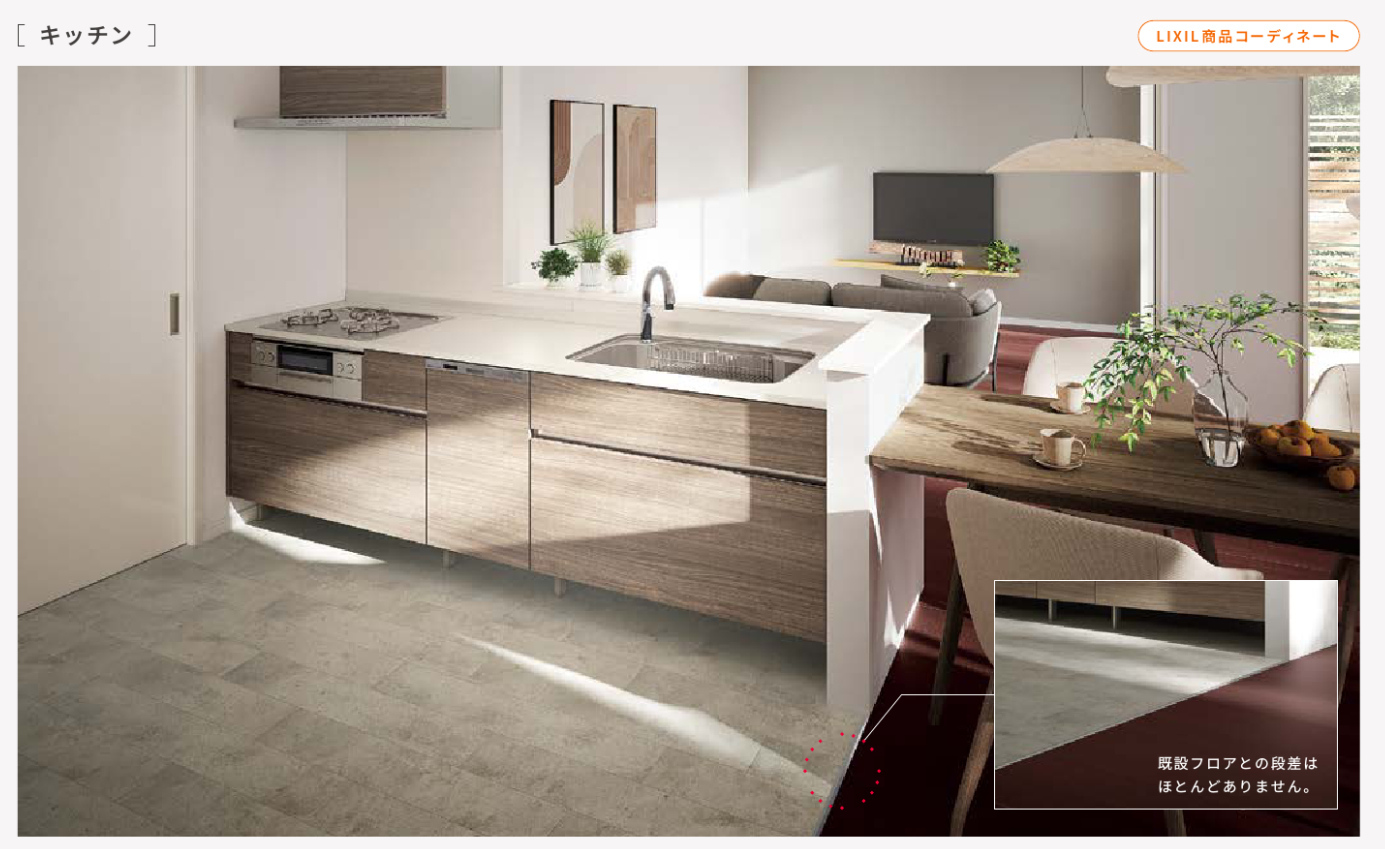 LIXIL「うわばReフロア」は、今お使いの床に重ねて張ることができるリフォームの床材です。床暖房やキッチンなどの水まわりの空間や、ペットを飼われているご家庭にもおすすめのリフォーム床材です。