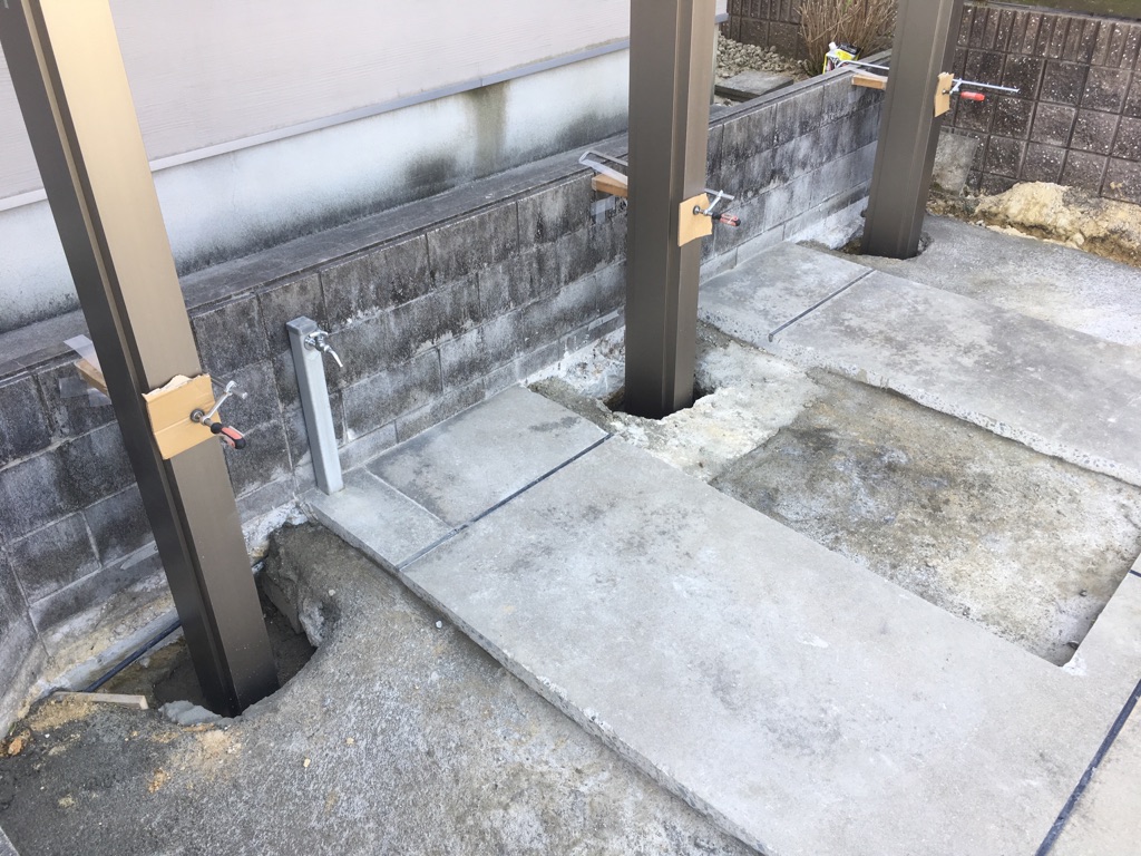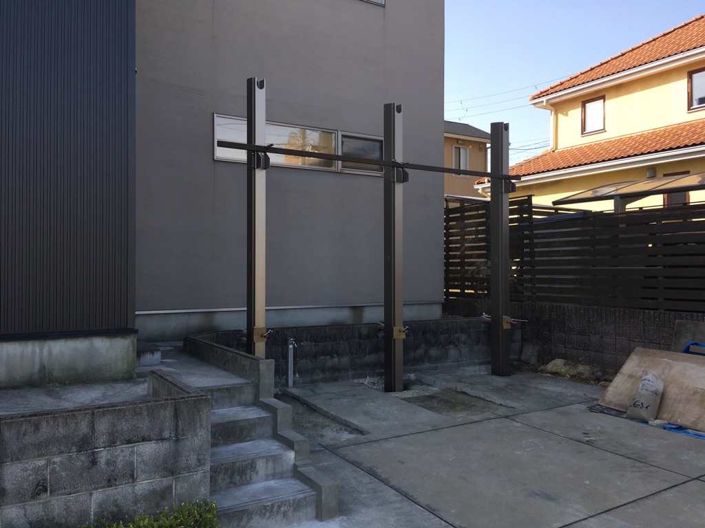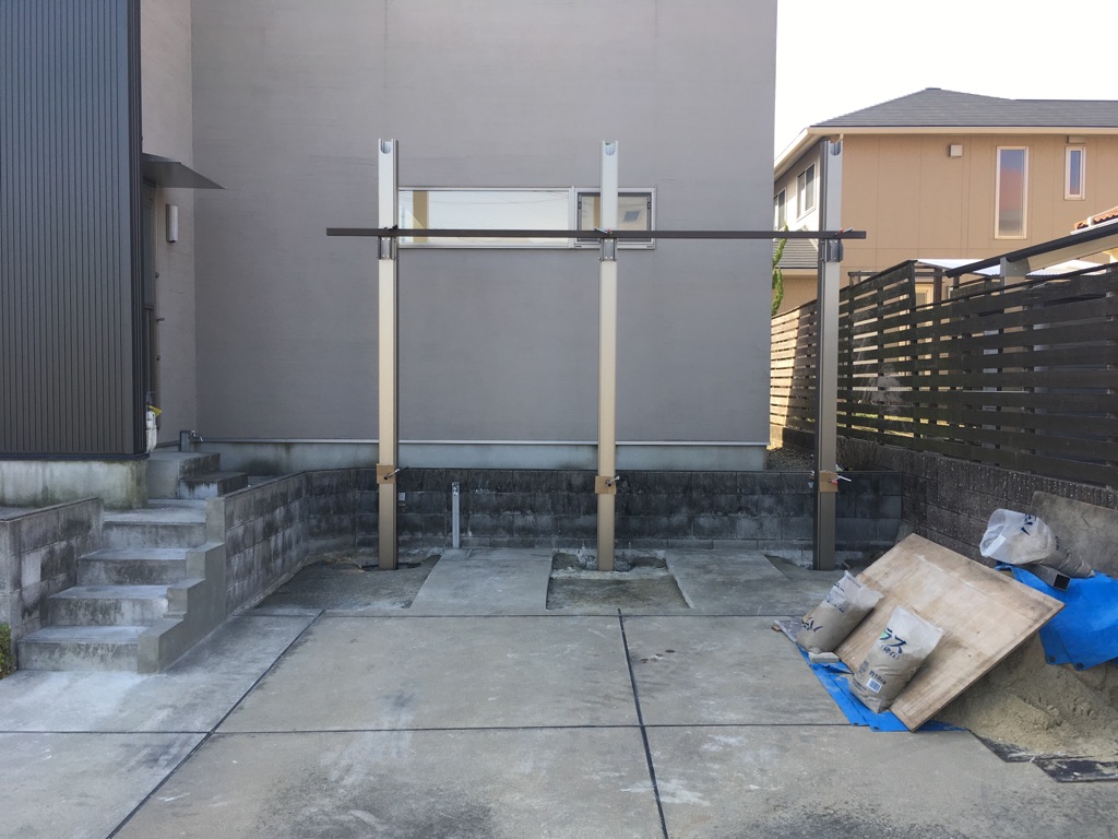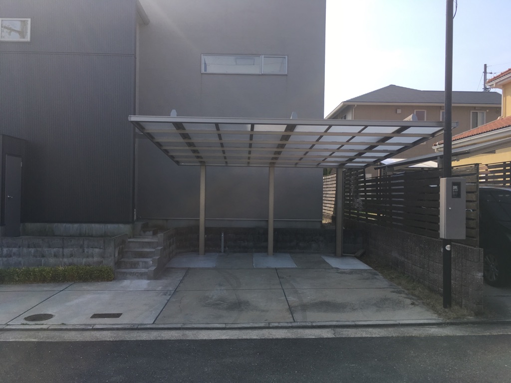 一般的なカーポートは両サイドに柱が建ちます。車の出し入れのために両サイドに柱がない商品をご希望されましたので三協立山アルミのダブルフェースをご提案し採用いただけました。柱が建つのは後方のみですので車の出し入れもスムーズですし見た目もスッキリ仕上がりました。後方の柱のみで支えますので通常の基礎工事より強固な基礎工事が必要です。