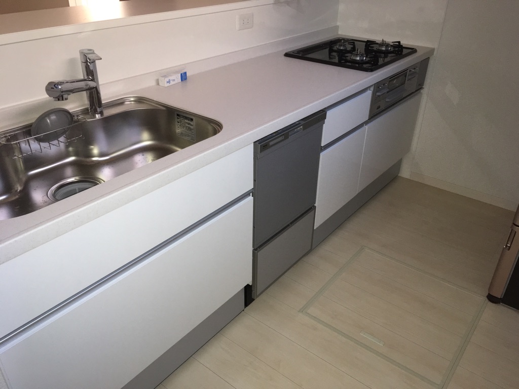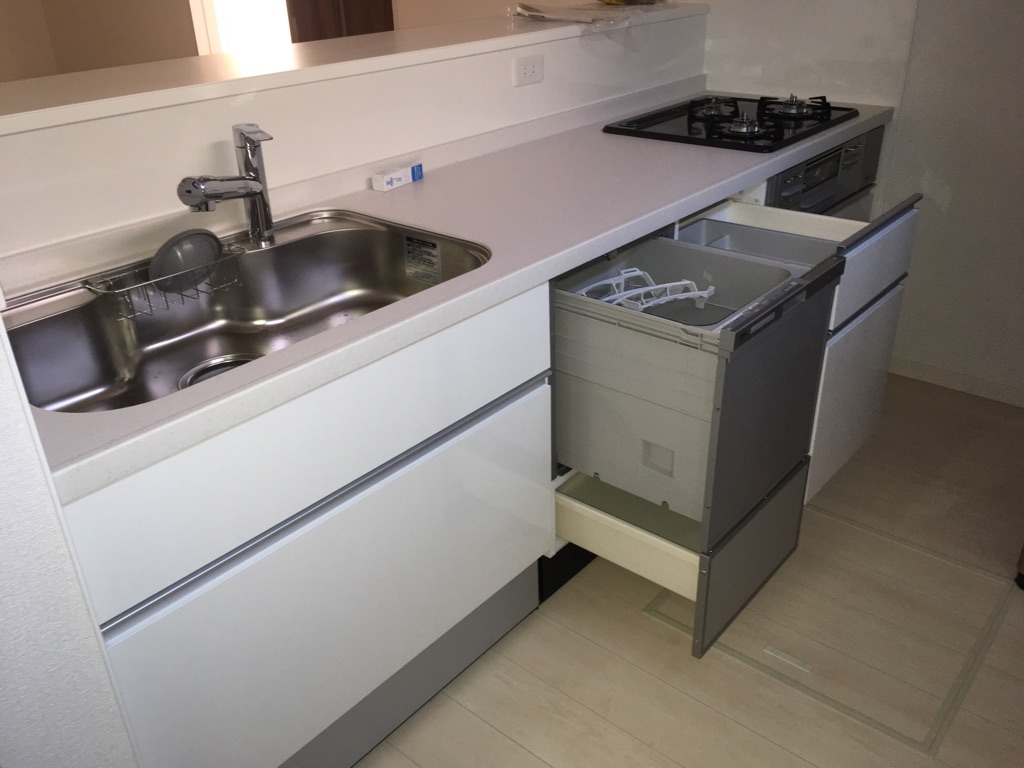 新築の住宅ですがキッチンに食洗機が付いておらず、引出部分に食洗機を組み込みたいとのご要望があり取り付けさせていただきました。引き出しの大きさが90㎝あり食洗機は45㎝ですので残りの引出はカットして再利用できるよう造作工事も含めた施工です。