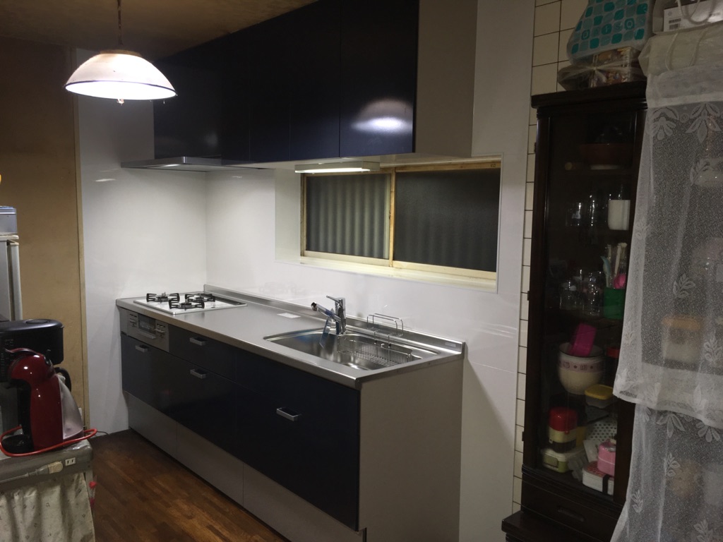 ご使用のキッチンの高さが低く調理時に腰が痛いとのことで、基本は高さ85㎝ですが90㎝のシステムキッチンへ入れ替えました。タイル部分もキッチンパネルを張りお掃除がしやすくなり、扉の色もブルーにし雰囲気がガラッと変わりました。