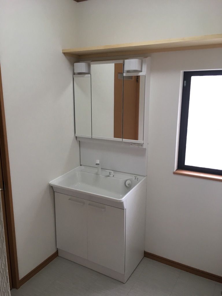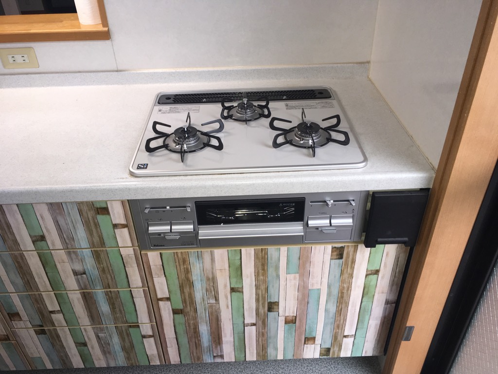 お客様よりガスコンロは掃除がしやすい、洗面化粧台は見た目がスッキリして収納が多い方が良いとのご希望がありました。ガスコンロはハイパーガラスコートトップで水無し両面焼きコンロ、洗面化粧台は3面鏡の商品で入れ替えさせていただきました。キッチンの扉にはお客様自身でシートを張り雰囲気がガラッと変わりました。