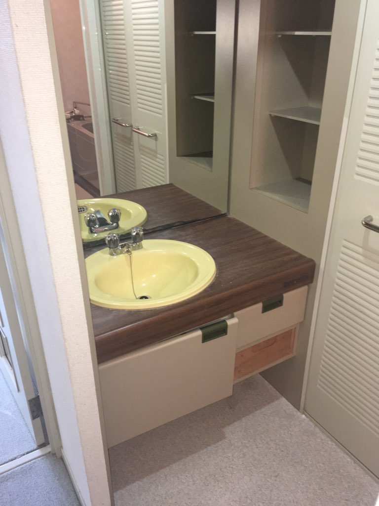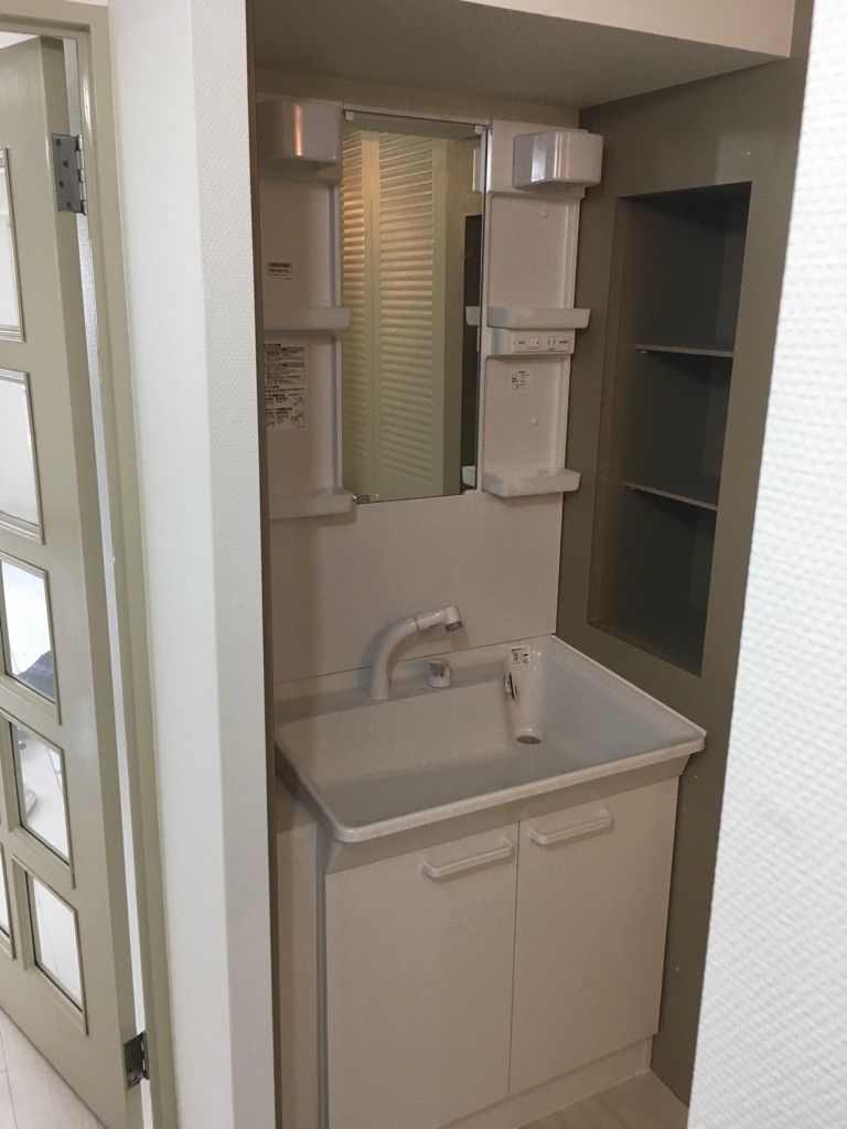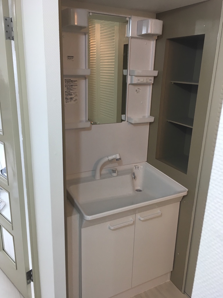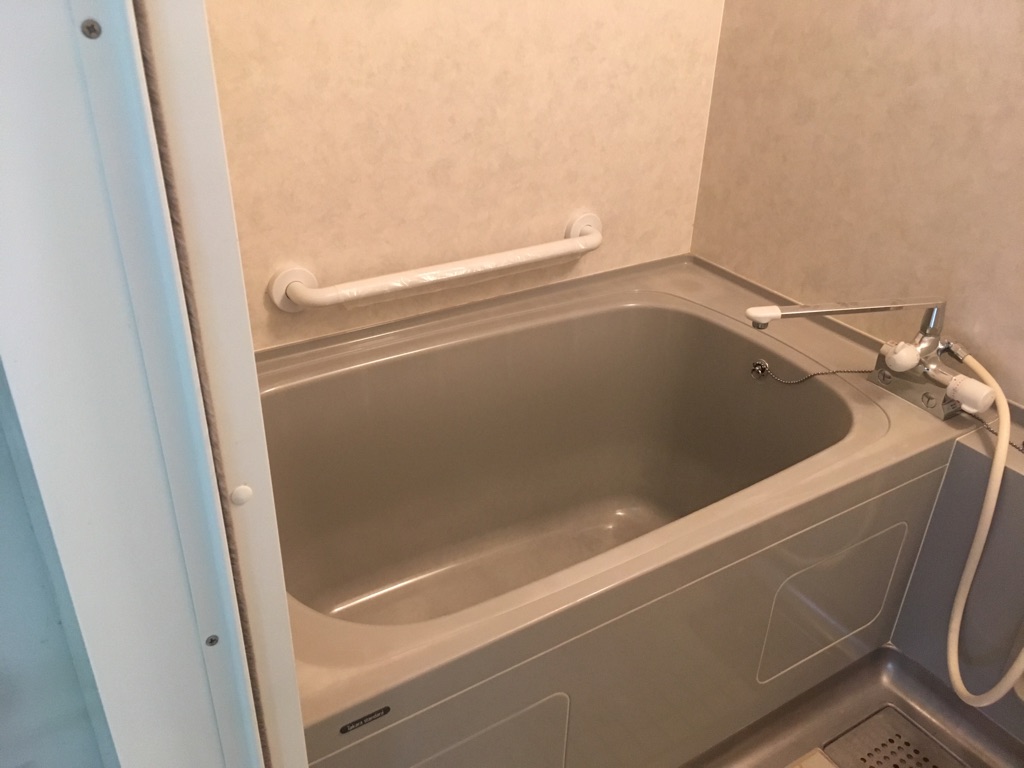 浴槽への出入りの際に手すりがあった方が良いとのことで浴槽側に1本手すりを取り付けました。後付け用の手すりですので手間のかかる下地工事は不要です。洗面化粧台も近々考えておられましたので同時工事でお安く工事をさせていただきました。