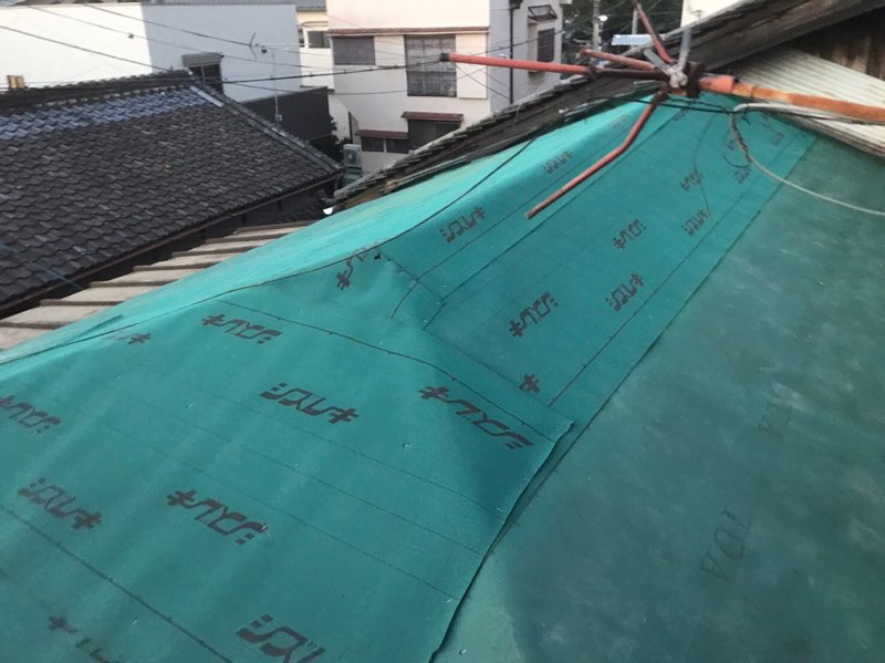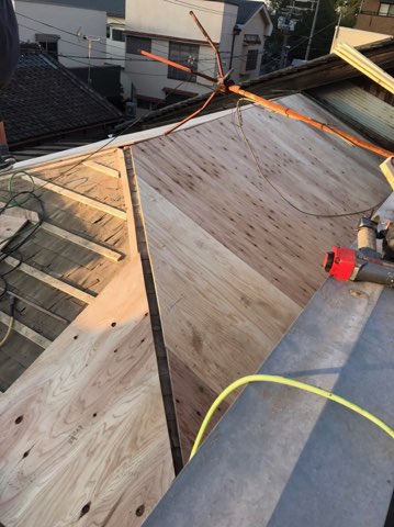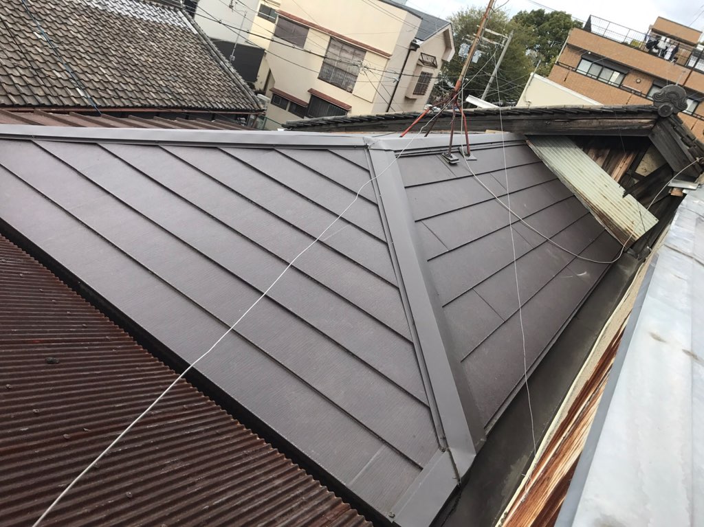 築50年以上の和瓦のお宅で雨漏りをしていました。補修の話もありましたが痛みが酷く補修では雨漏れを止めることは難しい状態でしたので現状の瓦を撤去し、下地も新しく作り替え、軽量で断熱性もあるガルバリウム鋼板を葺きました。