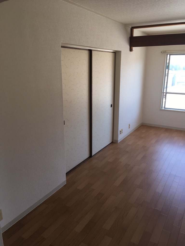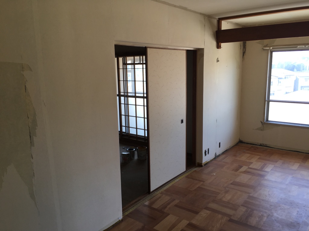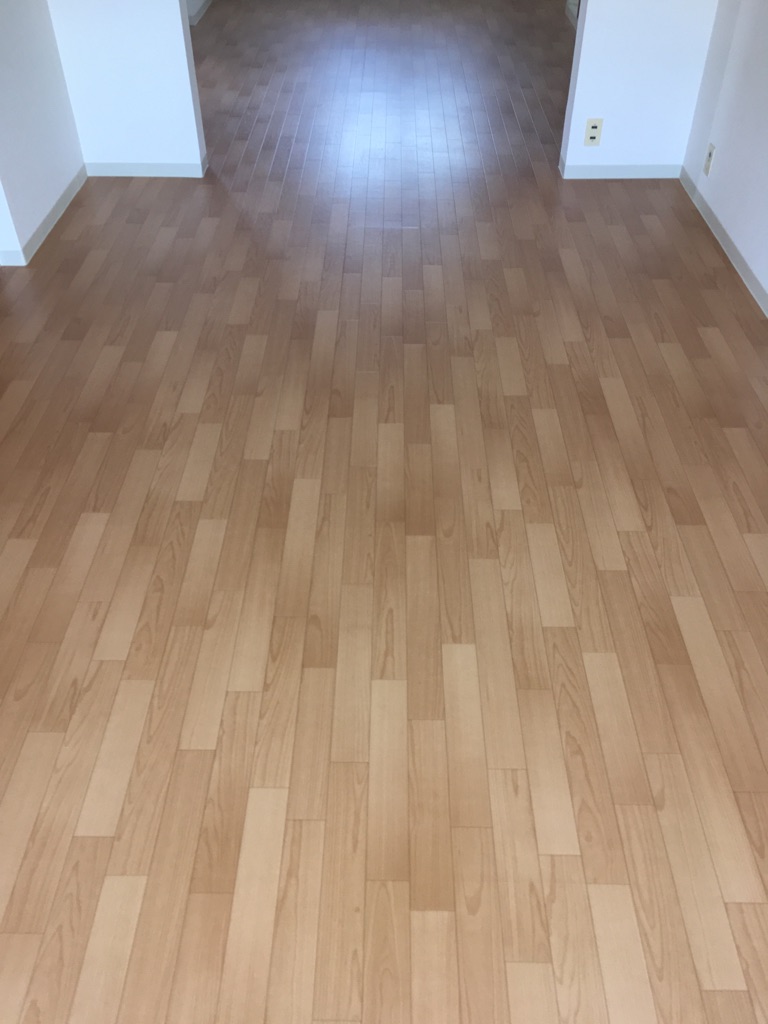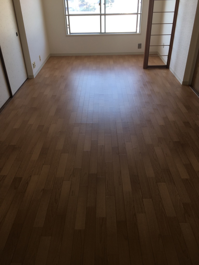 マンションLDKの床と壁の内装工事です。天井と壁はクロスを張替え、床は予算に合わせてフローリングの上からクッションフロアを張りました。所々傷んでいる箇所がありましたので補修してから張ってます。天井壁も明るくなり、床はフローリング調に仕上げました。
