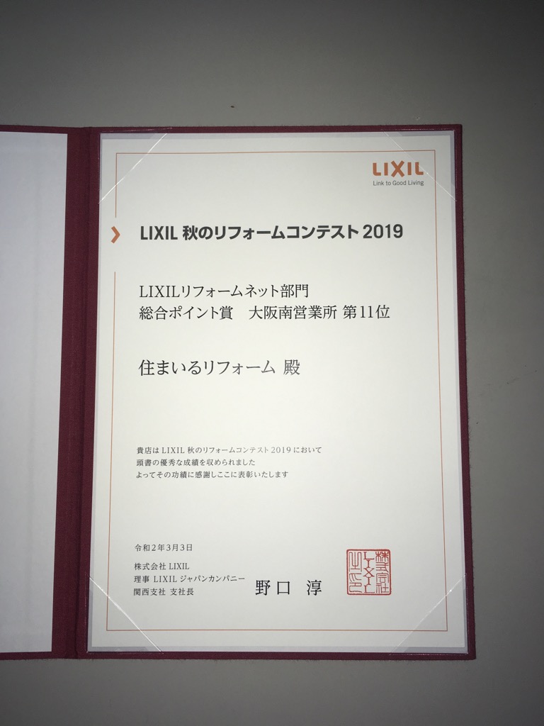 LIXIL 秋のリフォームコンテストで入賞いたしました。 2020/03/16 LIXIL 秋のリフォームコンテスト2019 総合ポイント賞 第11位に入賞いたしました。 本当にありがとうございます!!! 水廻り商品、内装建材、エクステリアまで全てLIXIL商品でリフォームできます。 LIXIL商品でリフォームをご検討の際は、住まいるリフォームまでご相談ください!!