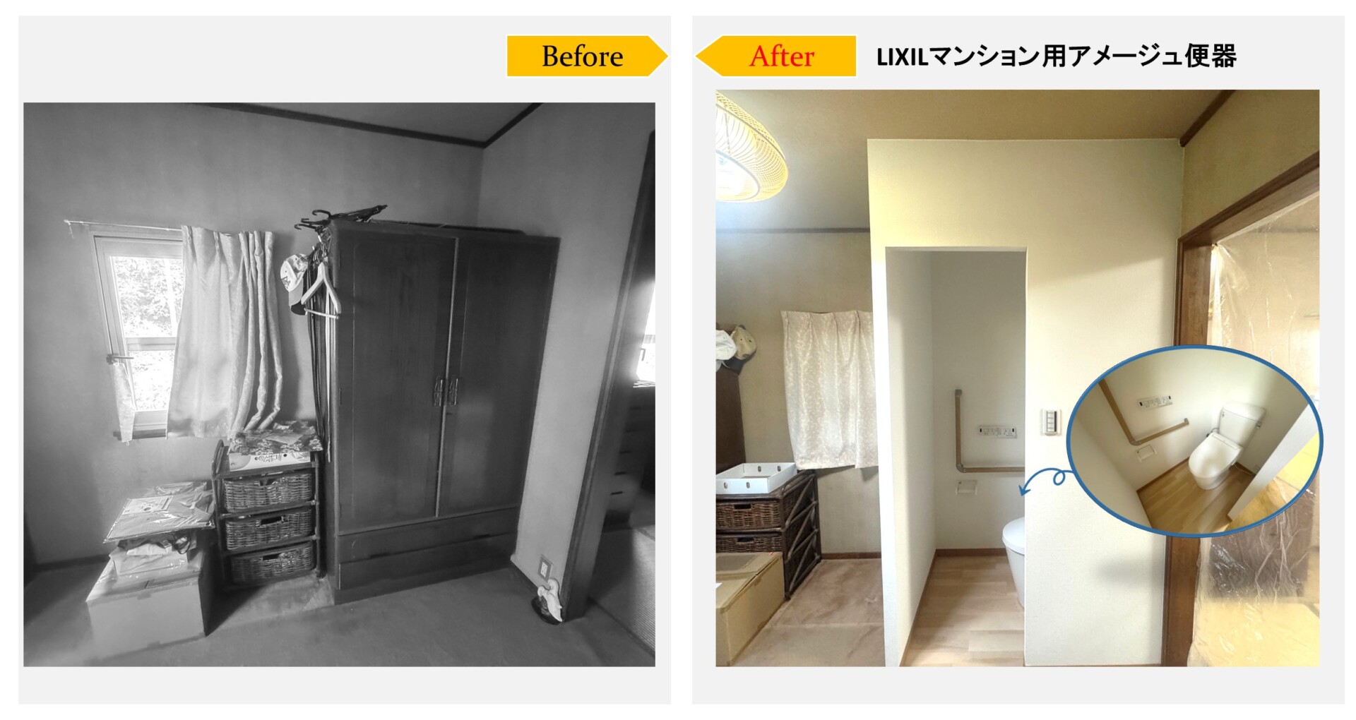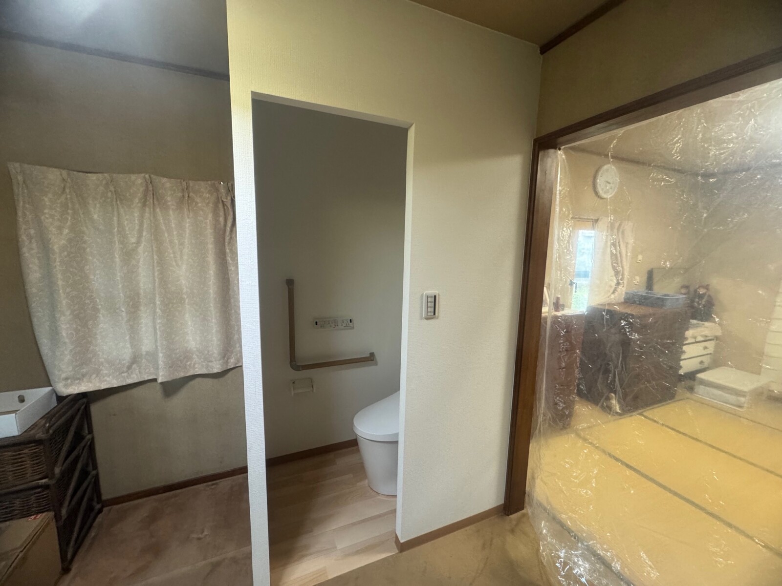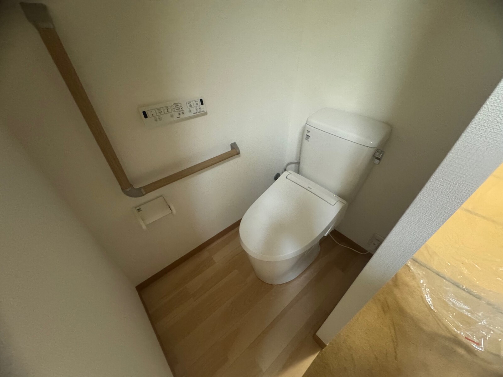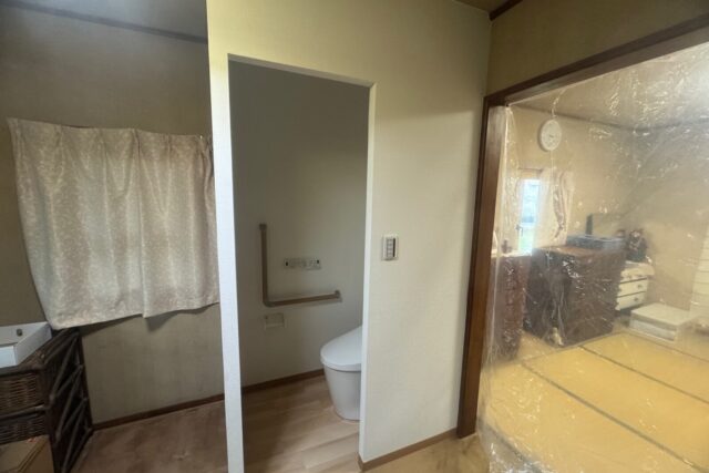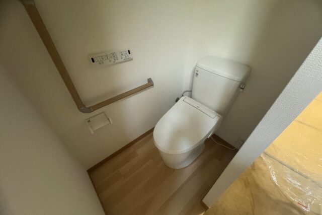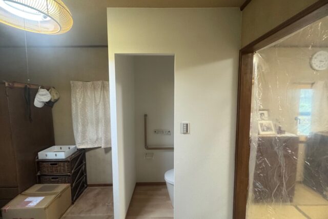 給排水工事→電気工事(コンセント・シーリング・スイッチ)→新規便器取付け→間仕切り壁新設→手すり取付け→内装工事(クロス張り、床クッションフロア)