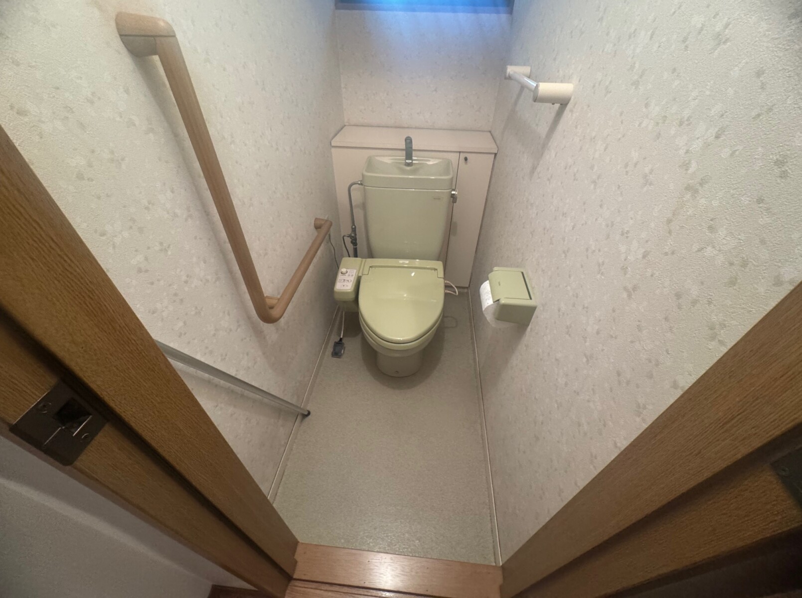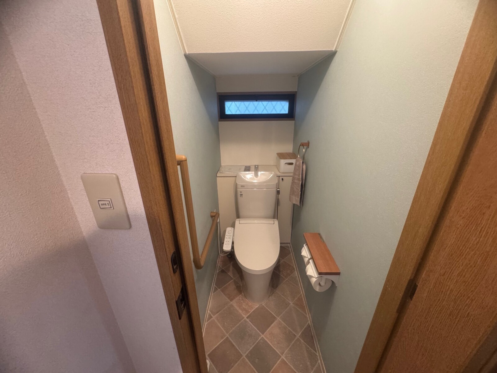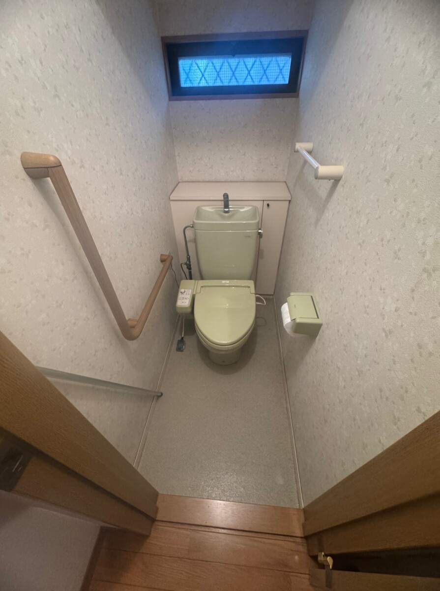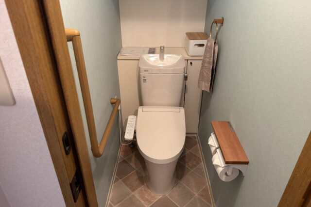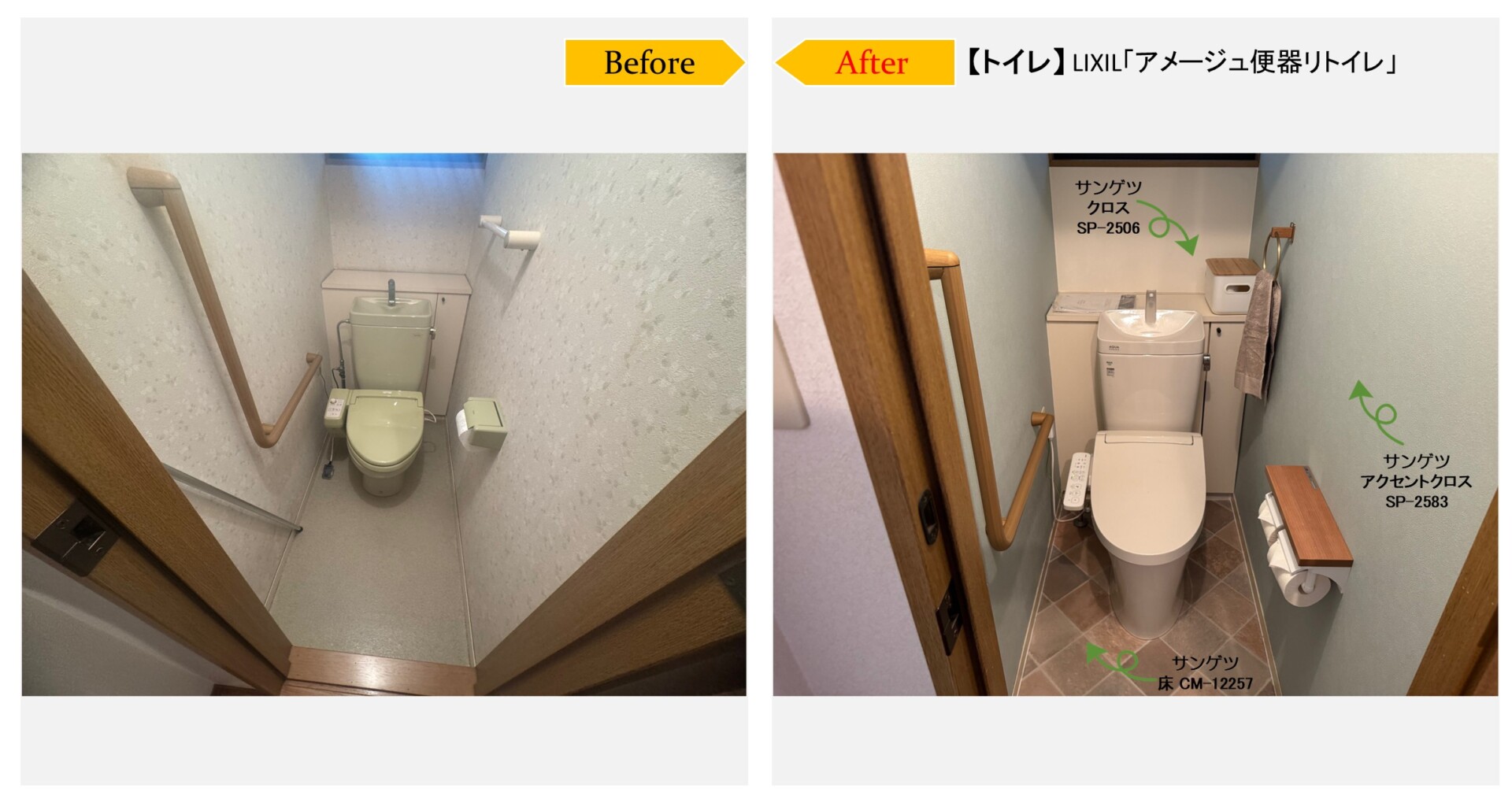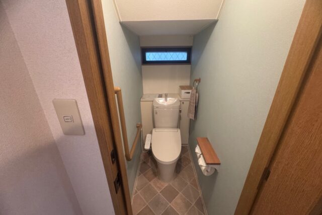 ご近所にお住まいのお客様から、中古住宅をご購入されて引越し前にリフォームのご相談を頂きました。お気に入りのクロスやクッションフロアを選ばれるのに、サンゲツのホームページにある「マイコーデ 着せ替えシミュレーション」https://www.sangetsu.co.jp/style/ をお使いいただきイメージのものをお選び頂きました。選ばれたクッションフロアは、アクセントクロスともマッチして優しい色合いで温かみのあるトイレに仕上がり、イメージ通りにリフォームとできましたとお喜び頂きました。
