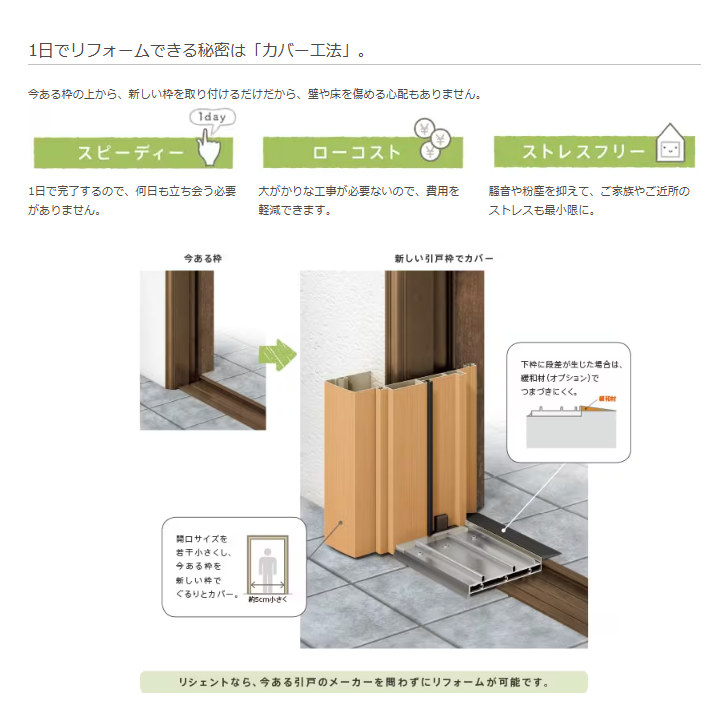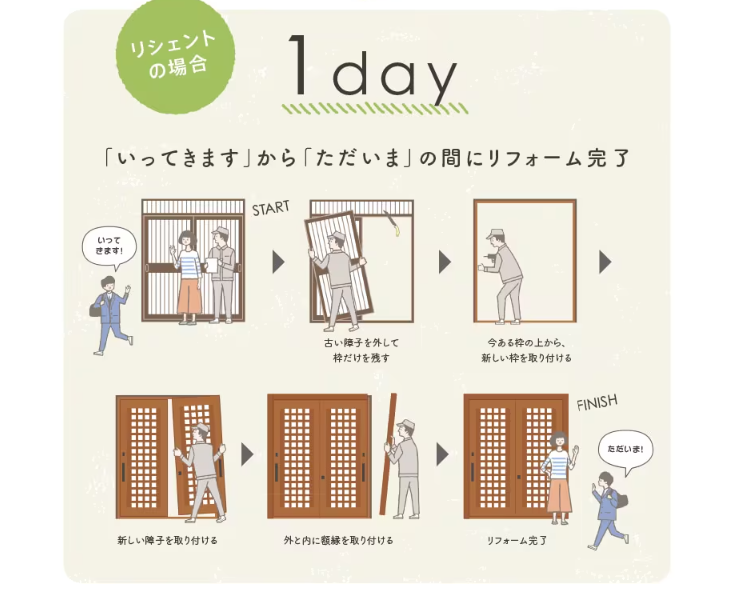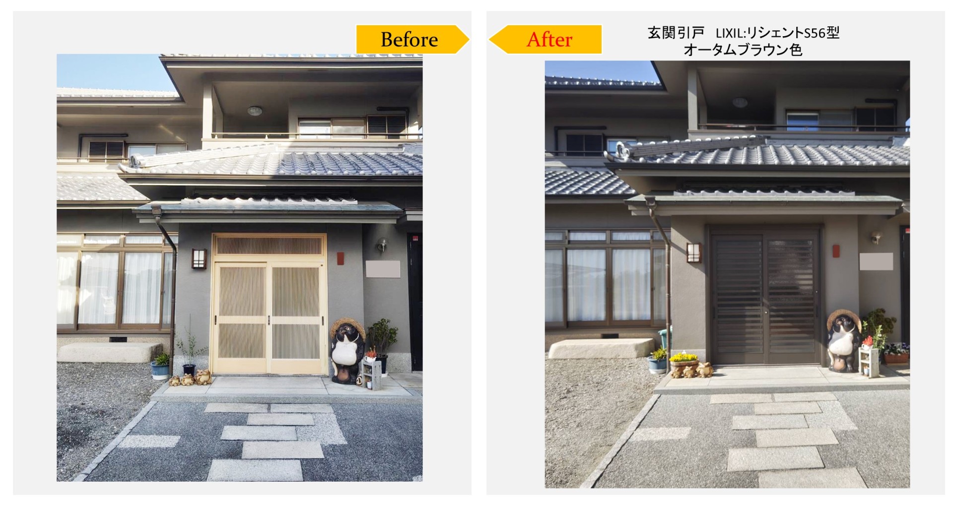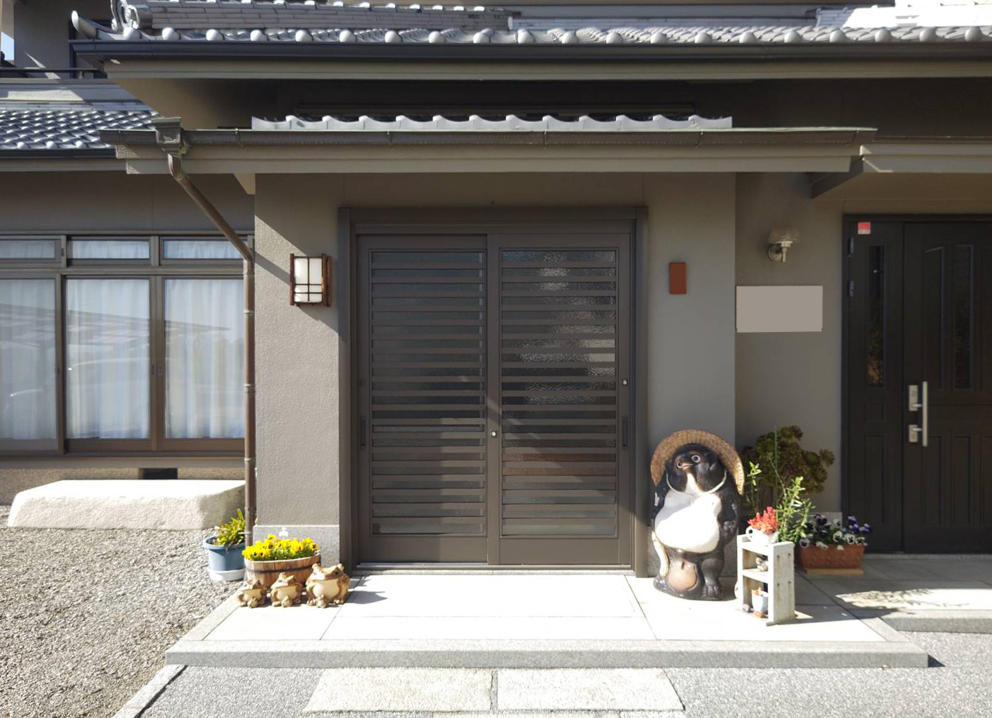 インターネットで、玄関ドアの取替え業者をお調べ頂きご来店でのご相談でした。ランマのある木製の玄関引戸をアルミ製でランマなしの玄関引戸に取替えご希望でした。ランマを無くした分、障子部分にガラスが入っているため玄関内が暗くなることも無く、ドアが高くなったので、背の高い方でも出入りがしやすくなりました。カバー工法での工事のため、1日で取替えできたことも、工事期間に時間取られることなく助かりましたとお喜び頂きました。