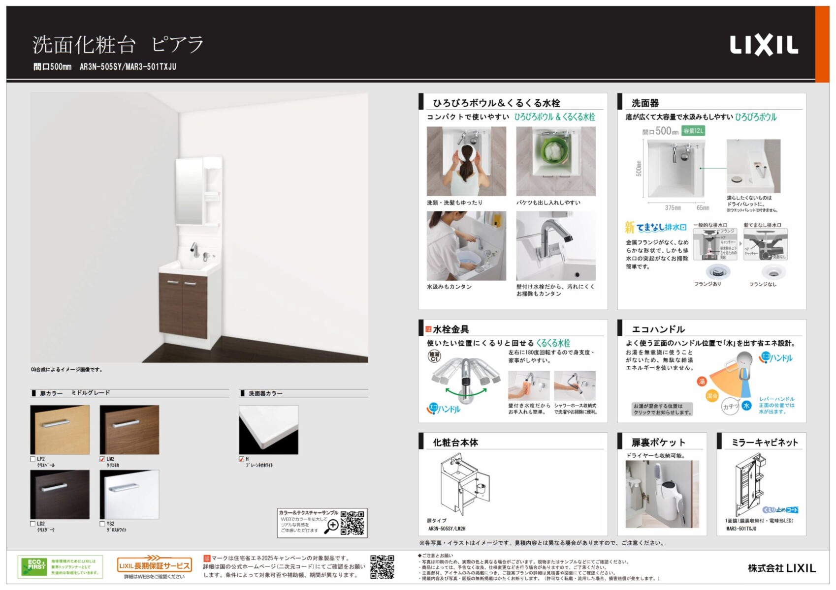 【洗面室】LIXIL:ピアラ 1面鏡 W500