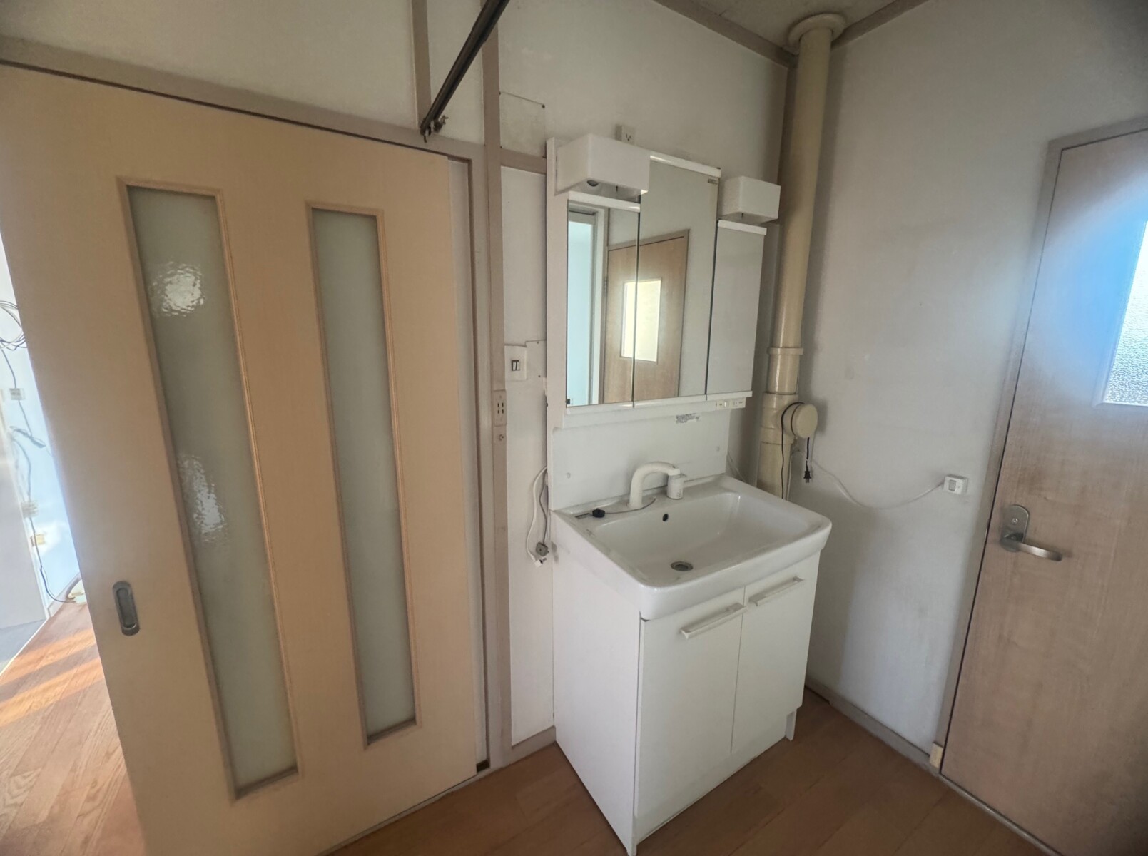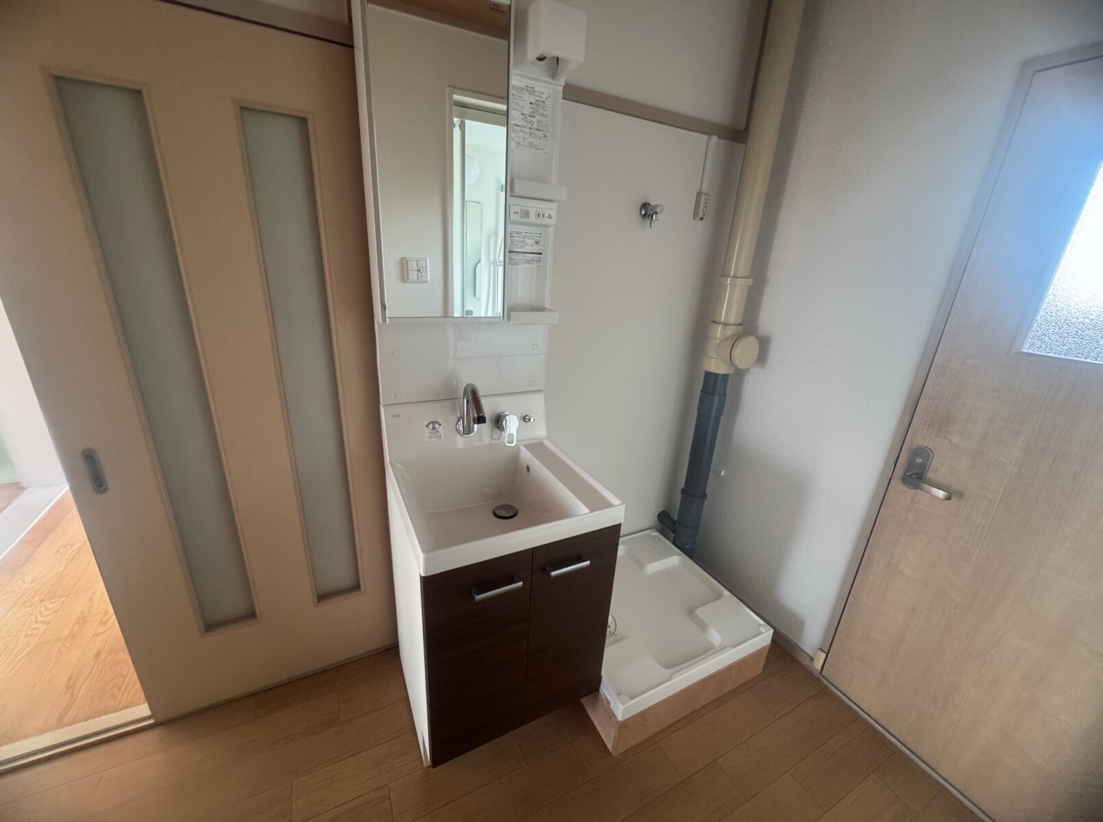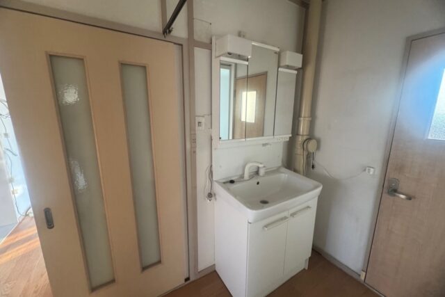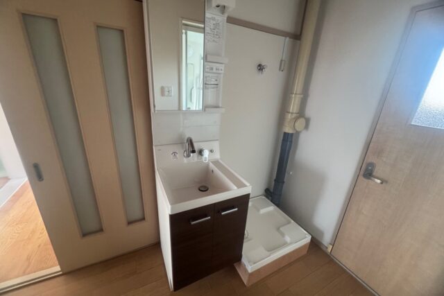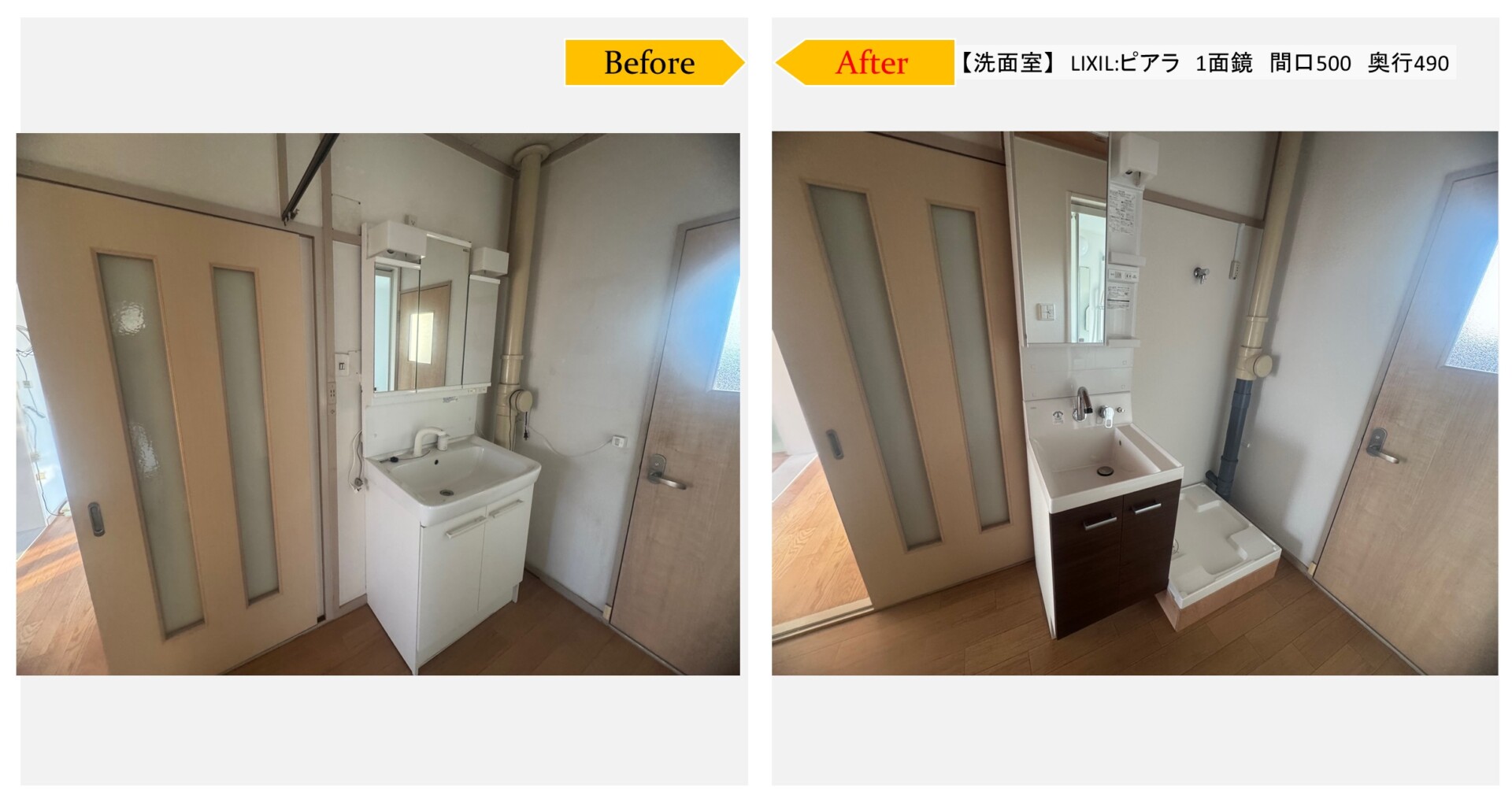 既存洗面化粧台撤去→給排水工事(洗面化粧台、洗濯パン)→洗濯パン架台、洗面ミラー下地造作(木製)→新規洗面化粧台取付け→洗濯パン、水栓取付け