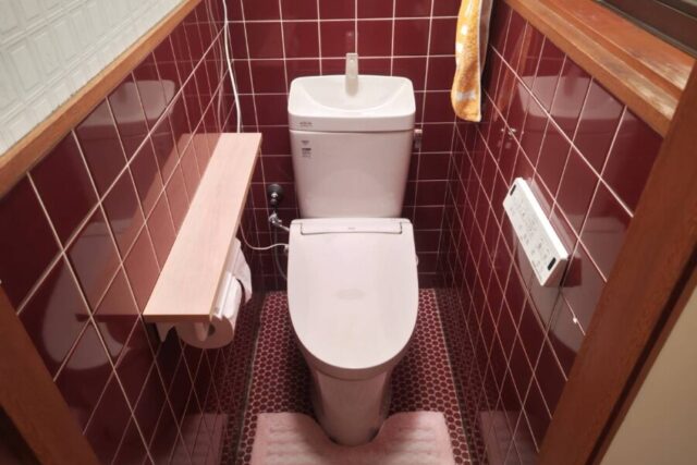 既存和式便器撤去→給排水工事→コンセント新設→床下地工事→壁下地工事(タイル部→新規トイレ取付け→内装工事天井、壁クロス、床クッションフロア張り