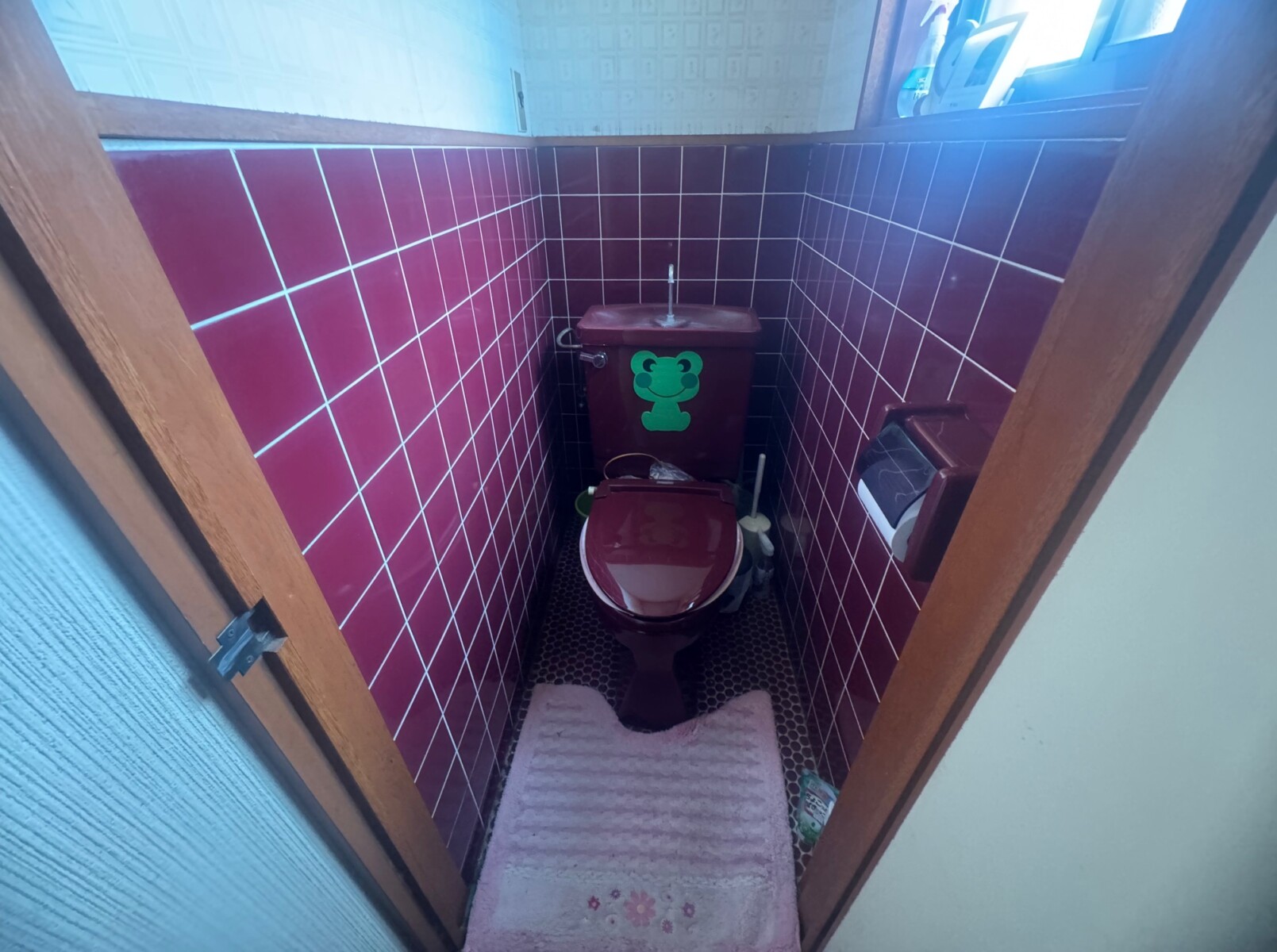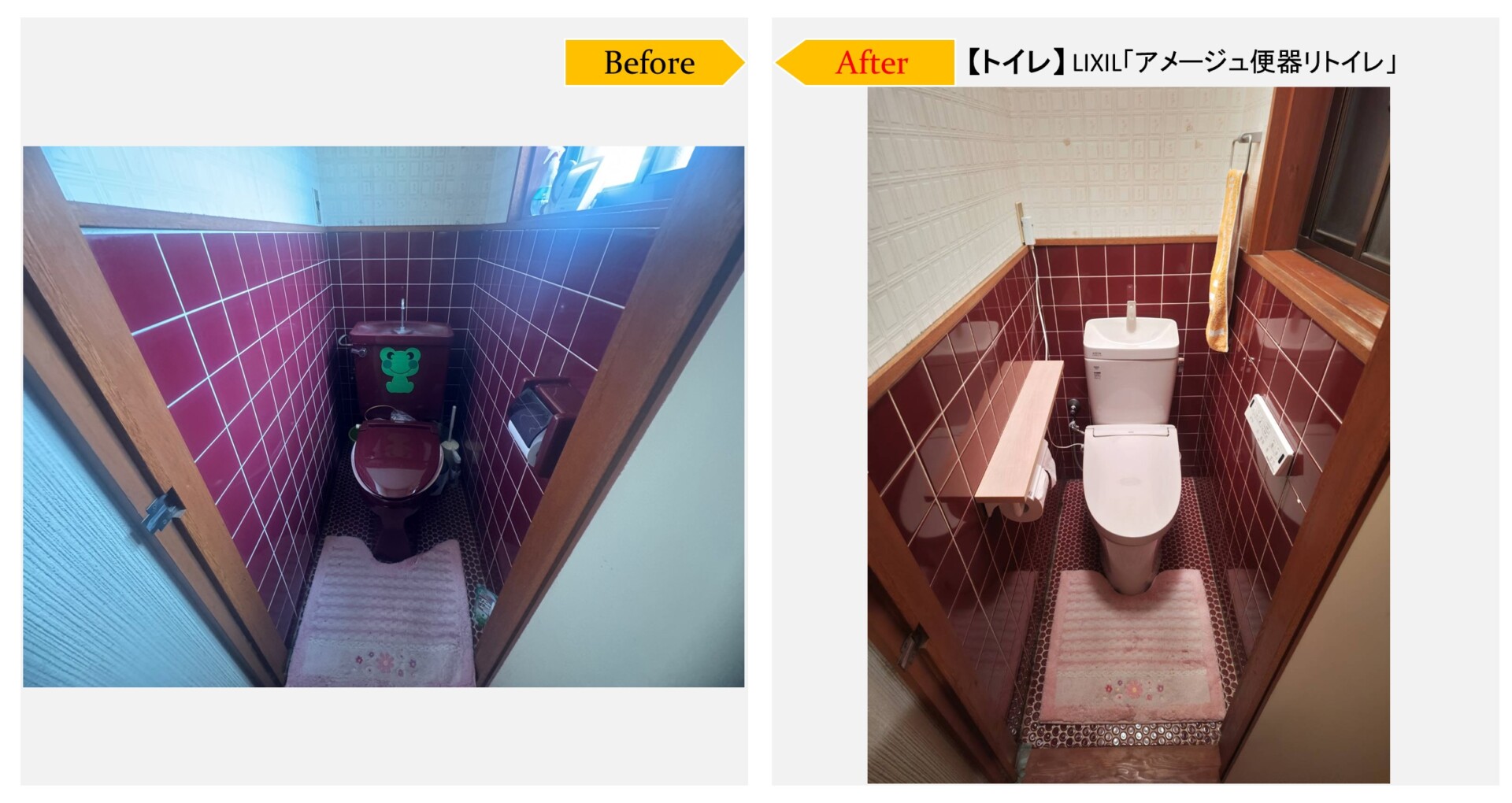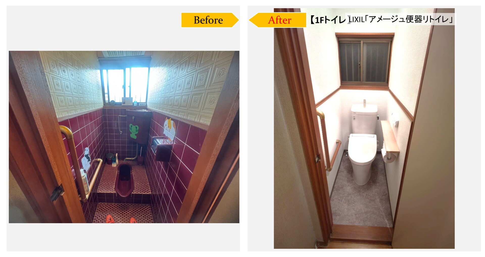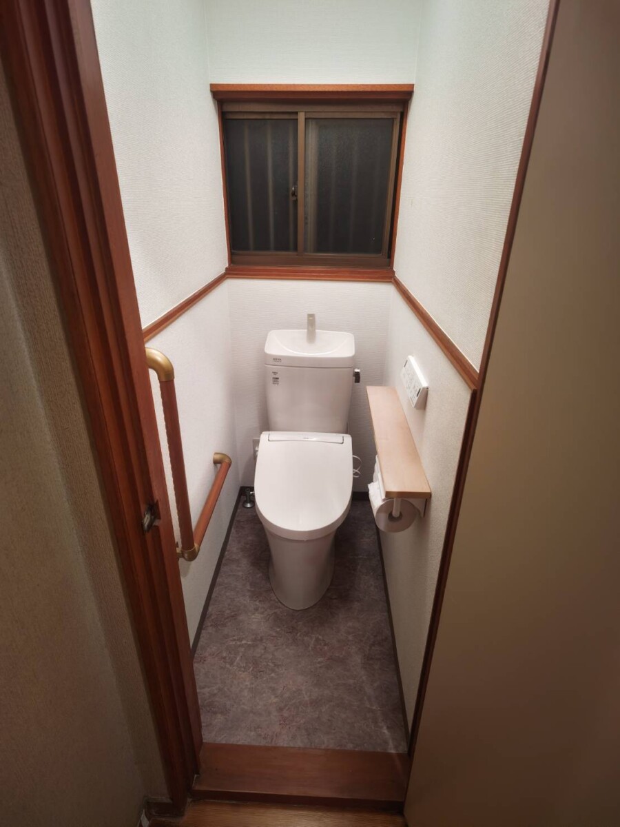 トイレの水漏れがきっかけで、在来工法タイル張りの浴室をユニットバスへ改修工事と、洗面室と1階2階のトイレのリフォームをご相談頂きました。1階トイレは水洗和式から水洗洋式の便器交換に伴い、タイル張りの腰壁の下地工事をしてクロス壁に、床はタイル張りからクッションフロアにリフォームしました。工事後、勝手口取替え工事のご依頼を頂きました。