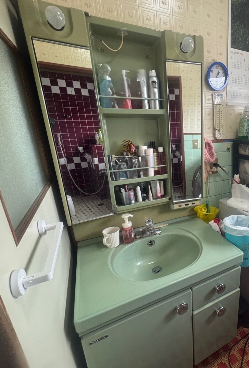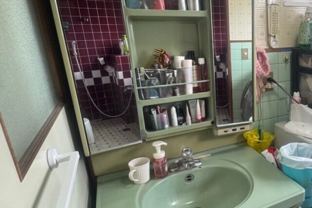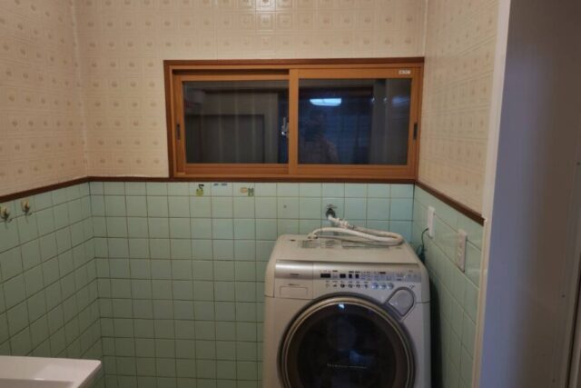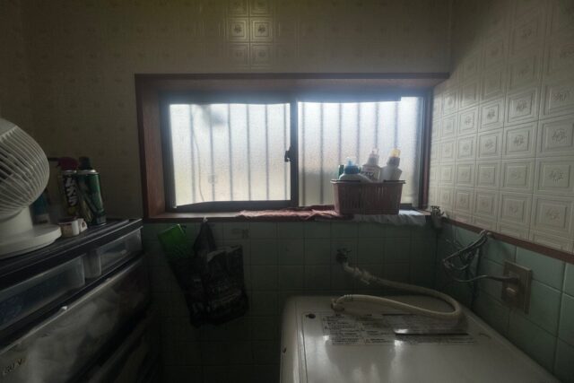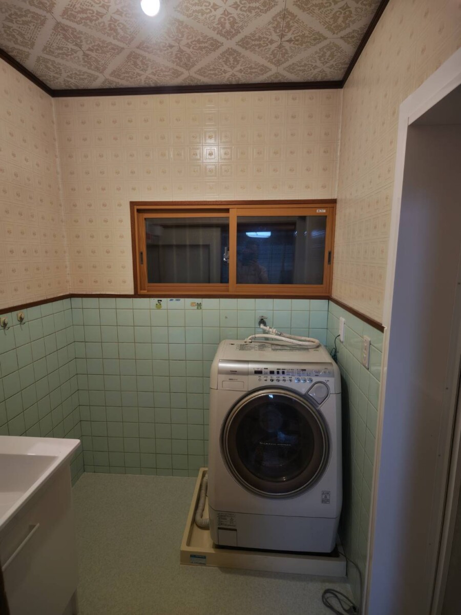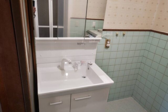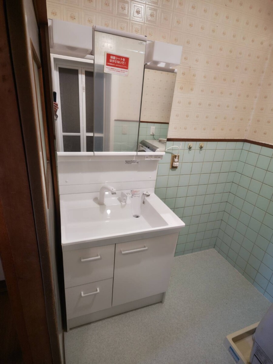 既存洗面化粧台撤去→新規洗面化粧台取付け→浴室前床下地補修→クッションフロア張り→内窓取付け