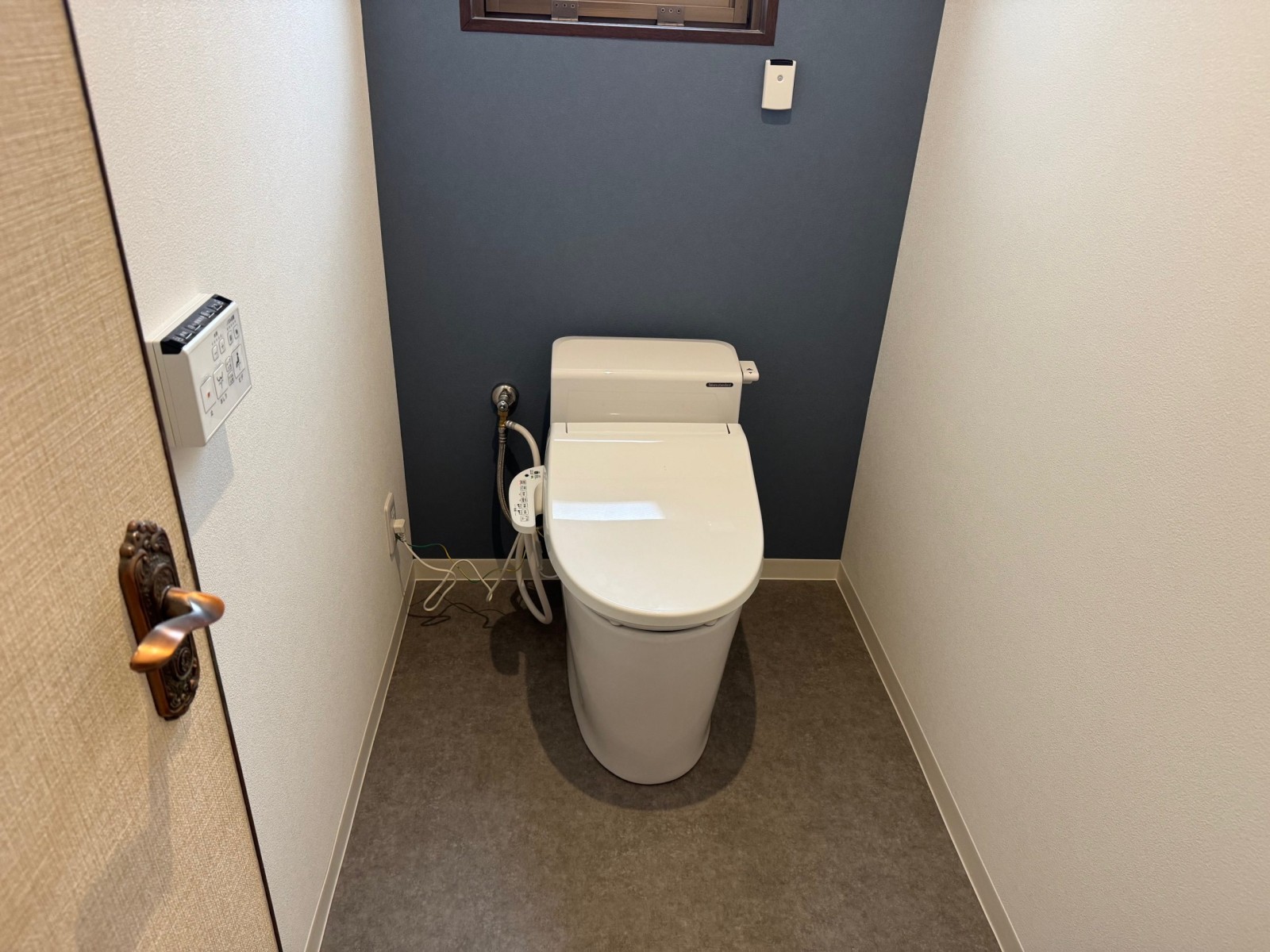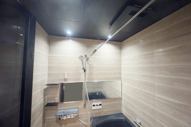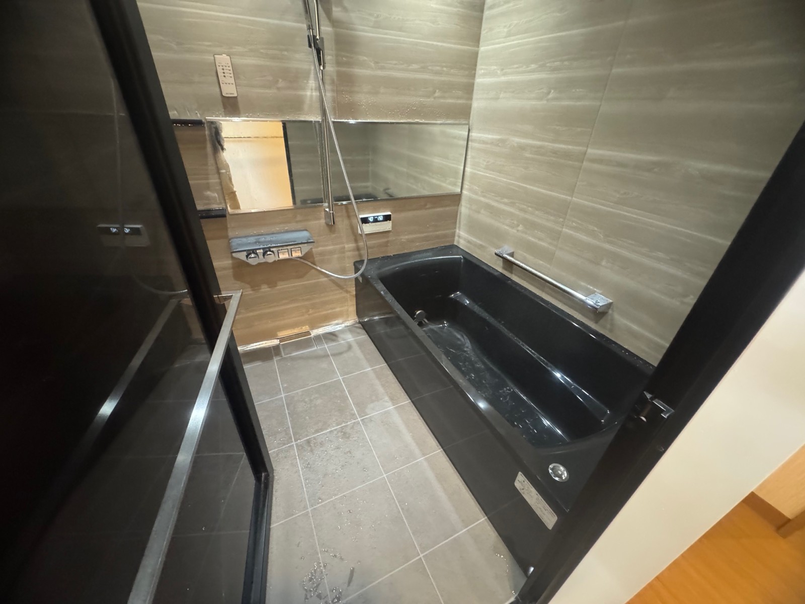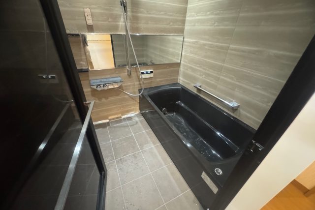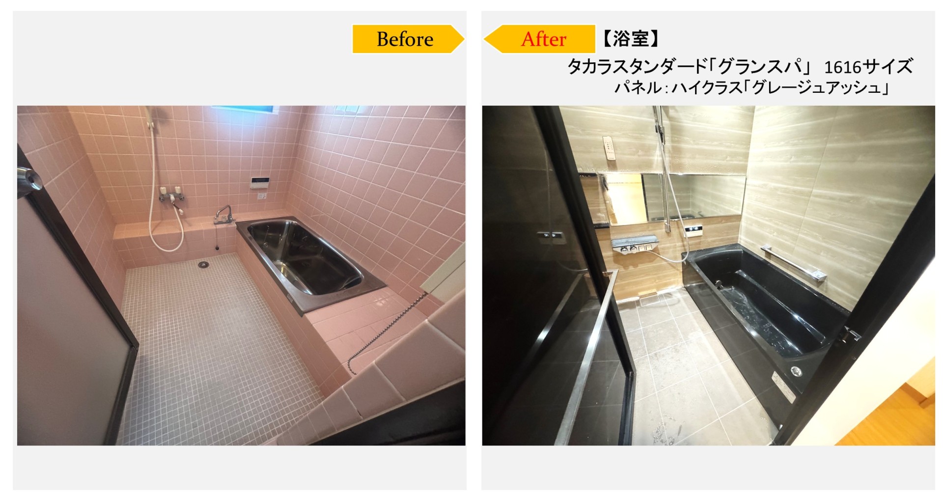 戸建物件をご購入でのリフォームご相談でした。入居前に工事をしたい、お風呂とトイレはタイル張りなので今風に変更、メーカーに希望は無くで、浴室換気乾燥暖房機は欲しい、和室を1部屋フローリングへとご希望でした。タカラスタンダードのショールーム見学に行かれて、アドバイザーと相談の上、浴室の窓は塞ぐ、浴室ドアは折戸より開き戸が良いなどとご希望に沿う内容での御見積りをさせて頂き、洗面化粧台もトイレもタカラスタンダードで揃えて、工事ご依頼となりました。壁パネルはグレージュアッシュ、浴槽はシュガーブラック、天井はチャコールブラック、ドア枠もブラックと落ち着いた重量感のある浴室に仕上がりました。