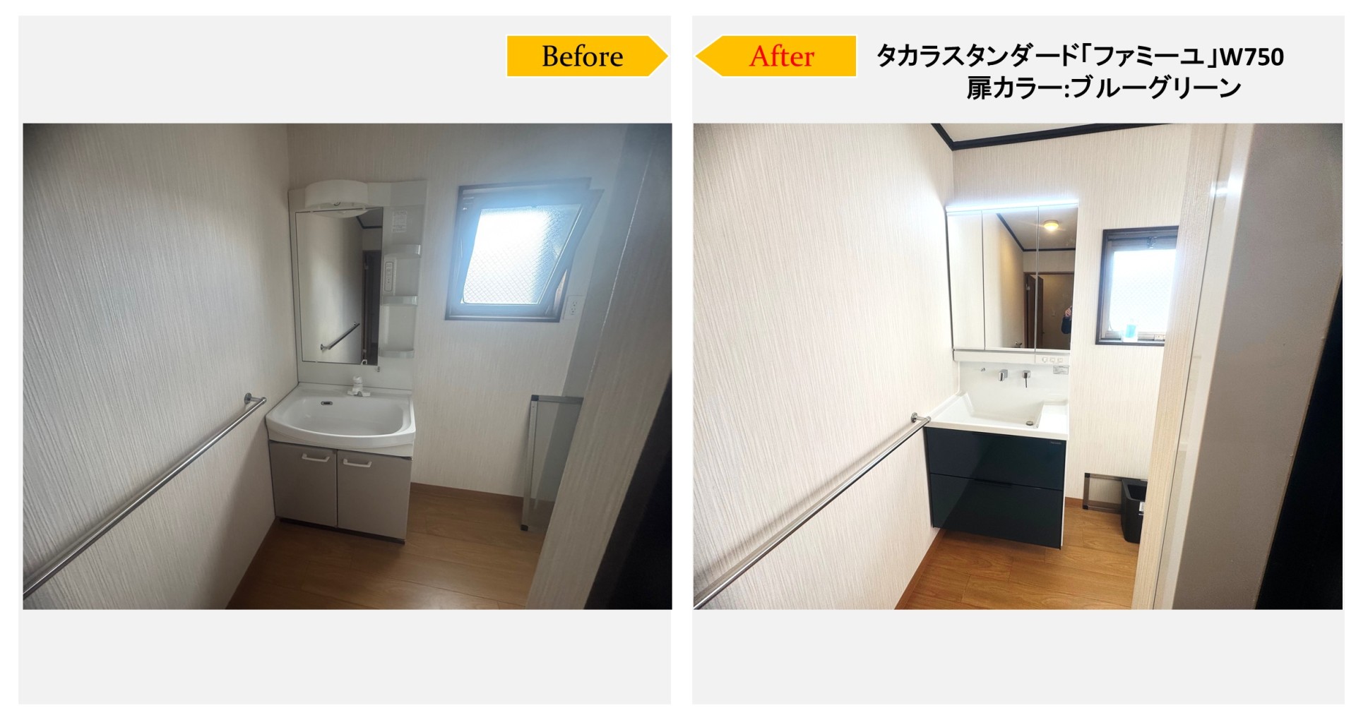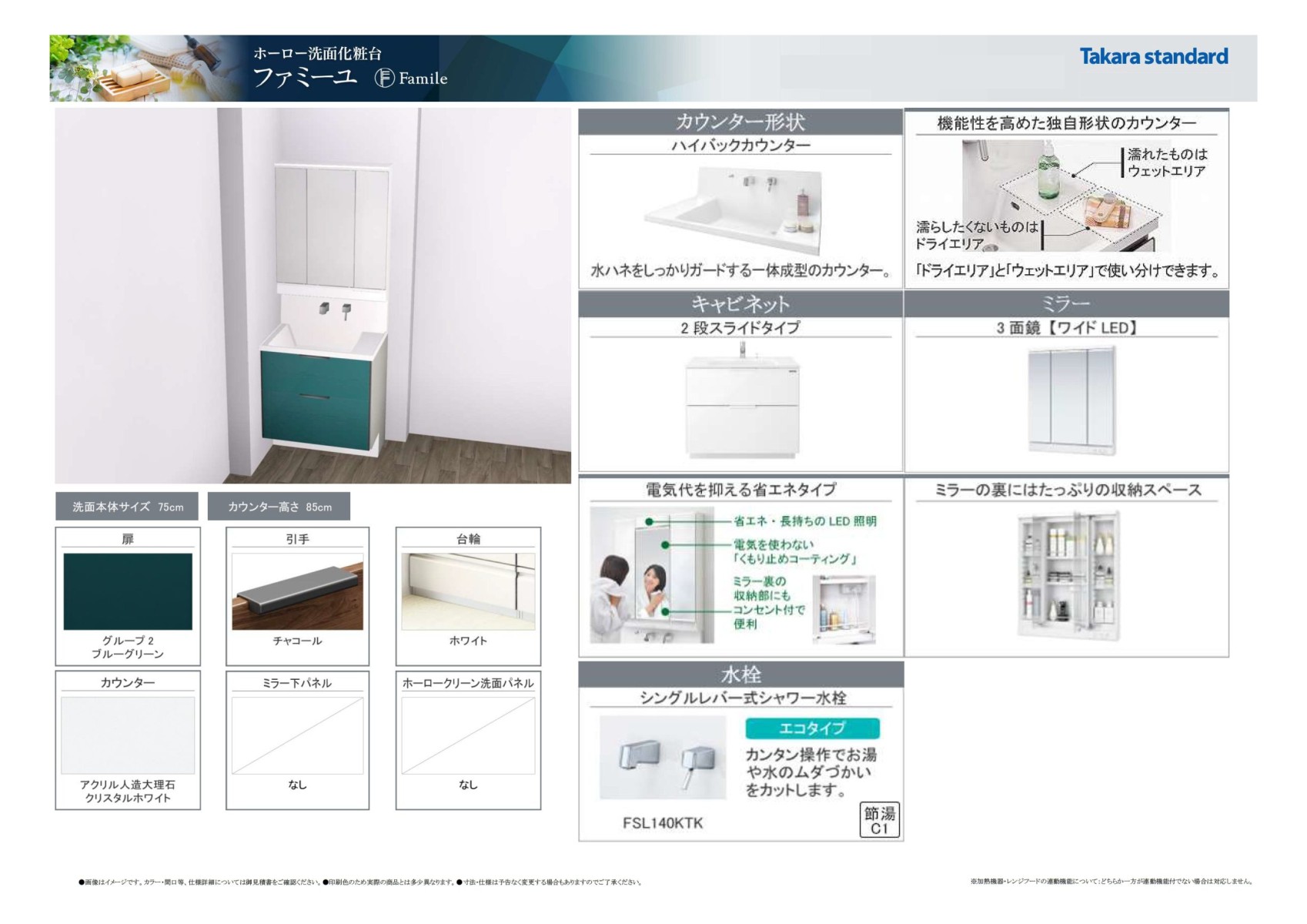 【洗面室】タカラスタンダード「ファミーユ」W750 扉カラー:ブルーグリーン