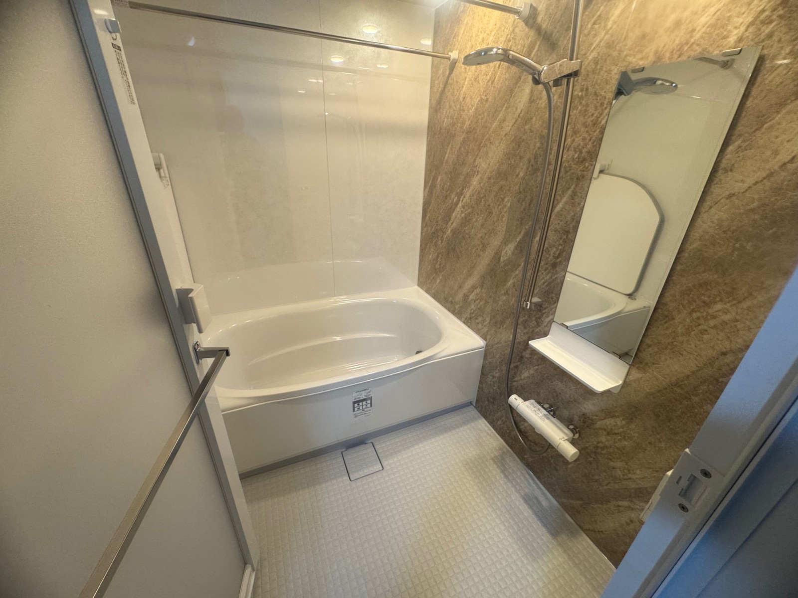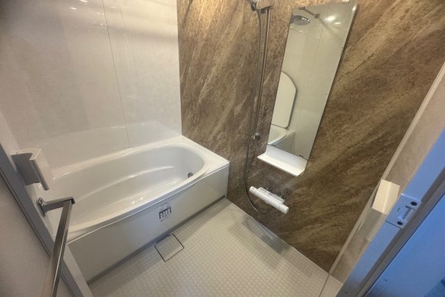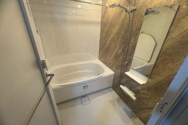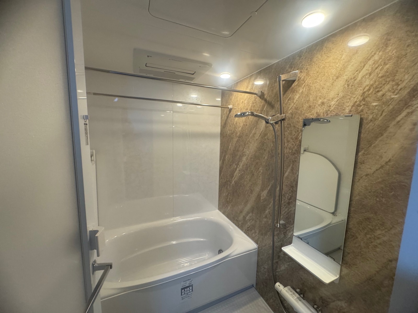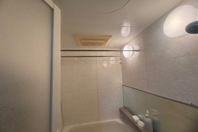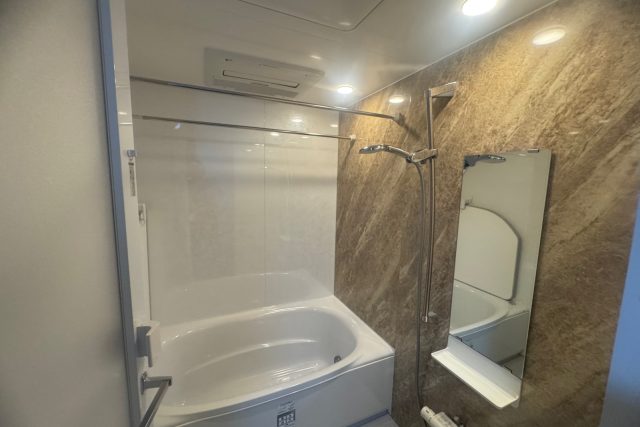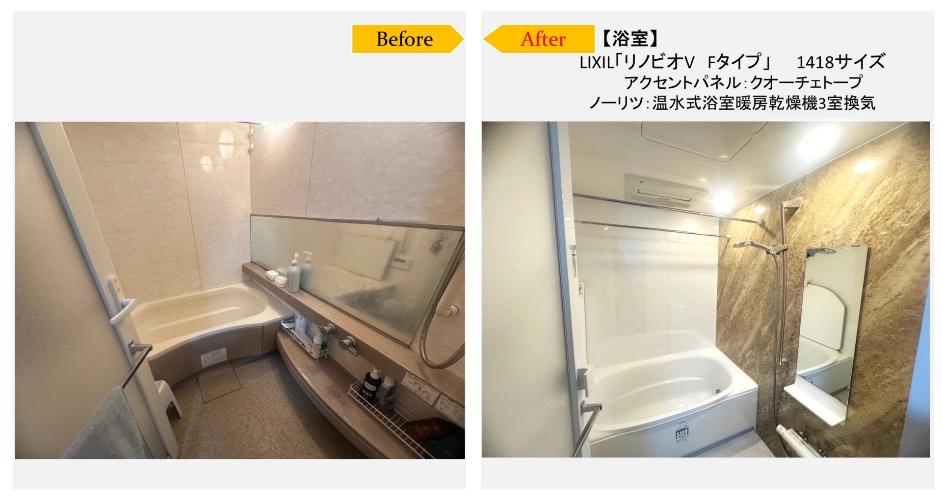 既存浴室が経年劣化で見栄えが悪くなったので取替えをご相談頂きました。事前にLIXILのショールームに見学頂いており、ご希望の商品もお決まりでのご相談でした。その上で、3室換気の浴室換気乾燥暖房機は、パワーと速暖性が良いノーリツのガス式をご提案させて頂きました。アクセントパネルは「クオーチェトープ柄」を選ばれ、上品で温かみのある浴室に仕上がりました。