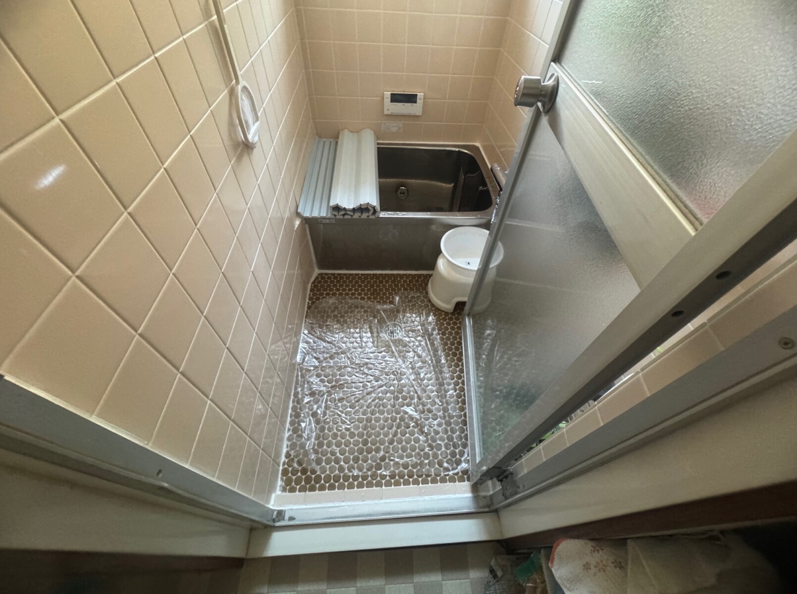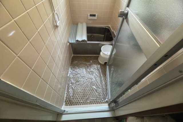 既存浴室解体→給排水工事(給水・給湯・排水・アダプタ取替)→電気工事(照明・換気扇)→土間工事→ユニットバス組立→間仕切り壁補修(ドア枠)