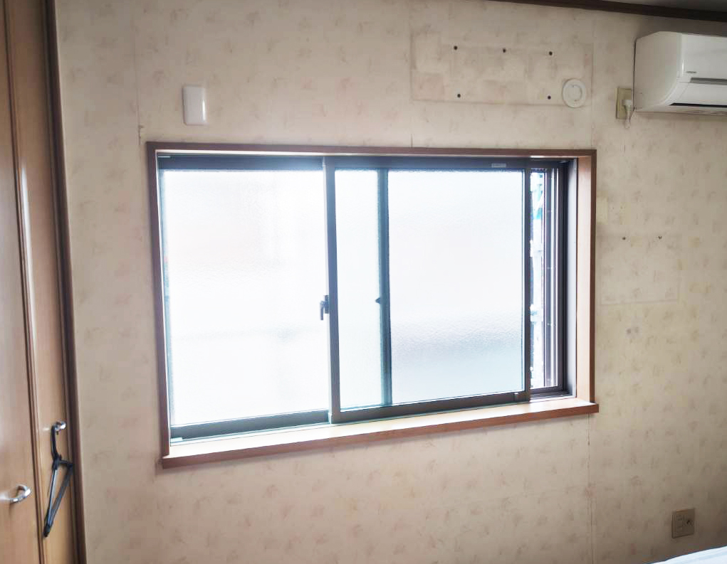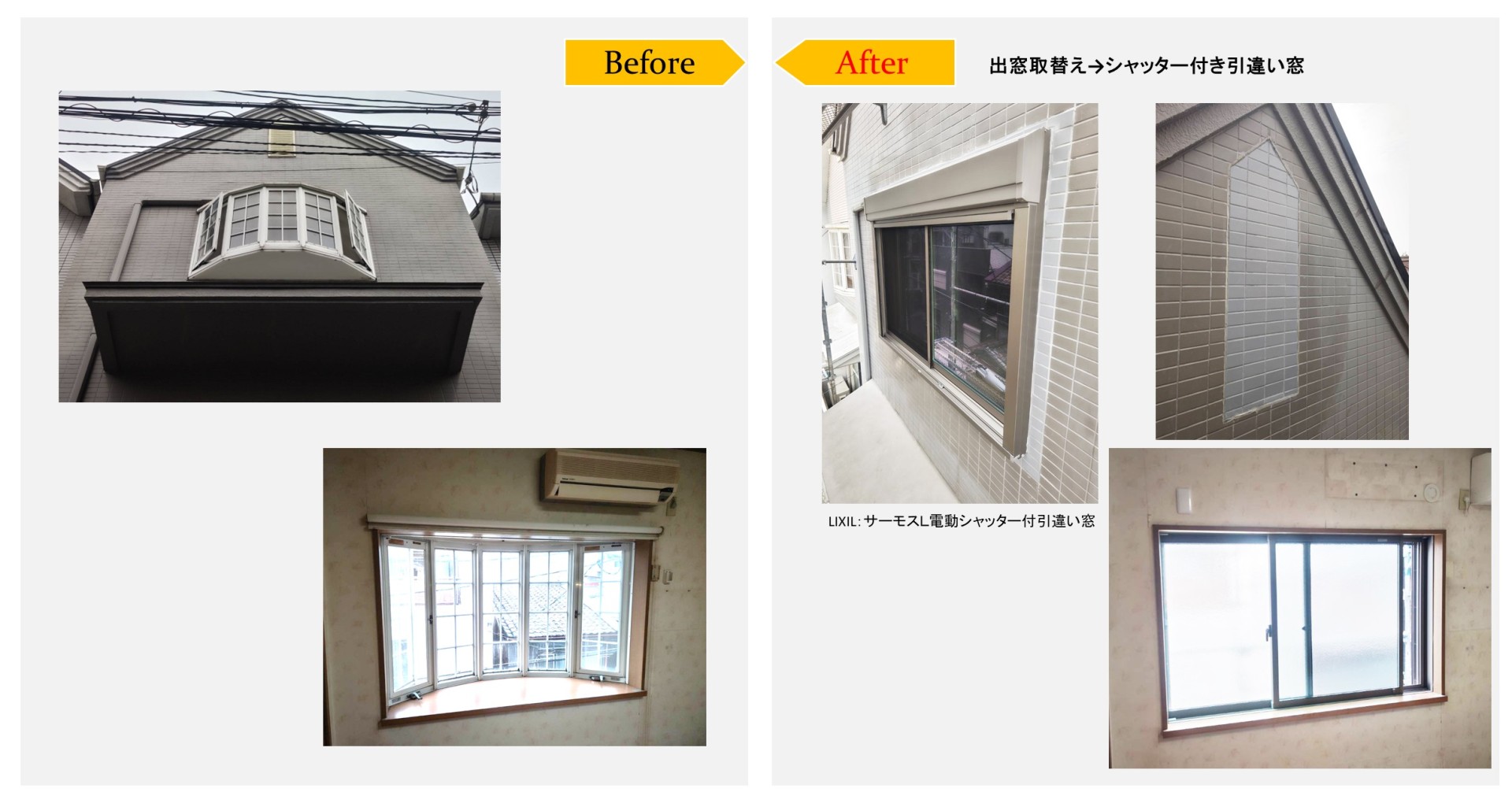3階の出窓を普通の窓にして電動式の雨戸シャッターに取替えしたい、屋根の下にある通気口に雨除けの庇をつけたいとご相談でした。窓のガラスを単板ガラスと複層ガラスの2パターンで御見積りをさせて頂きました。通気口に庇を付けて雨除けをご希望でしたが、内側から塞いであることが分かり、既設の通気口を撤去し、壁を左官工事後、タイル仕上げにし雨風を防ぐ方法をご提案させて頂きご依頼になりました。複層ガラスでの窓取替え施工で、「先進的窓リノベ支援事業」の補助金申請をさせて頂きました。完工後、洗面化粧台取替えのご相談を頂き工事をさせて頂きました。