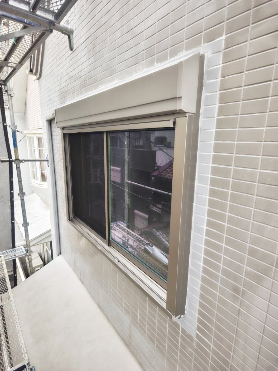 仮設足場→出窓解体撤去→電源仕込み・接続→電動シャッター付き引違い窓取付け→通気口撤去→左官下地補修→タイル張り