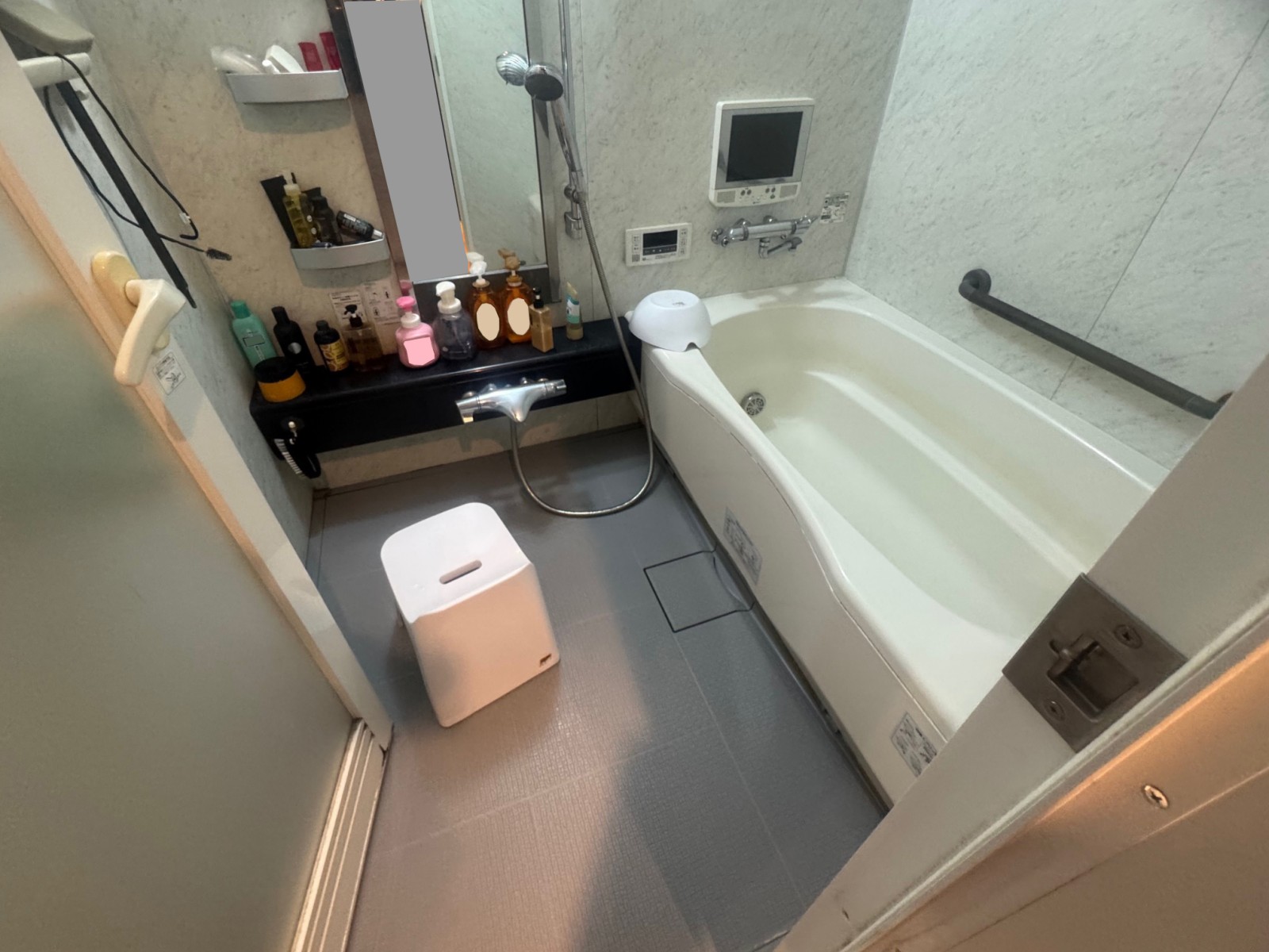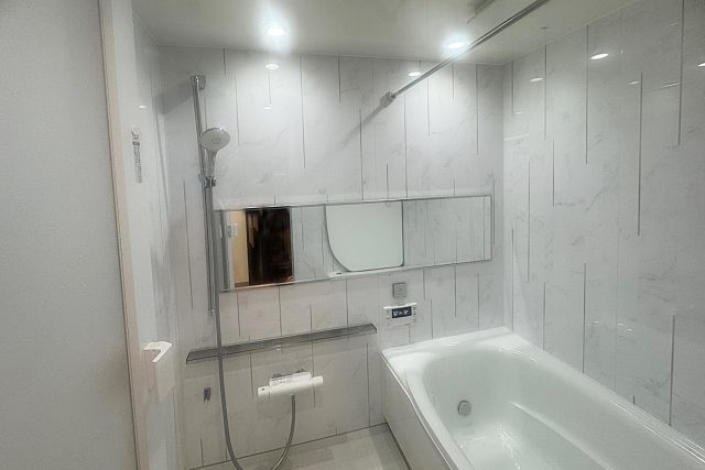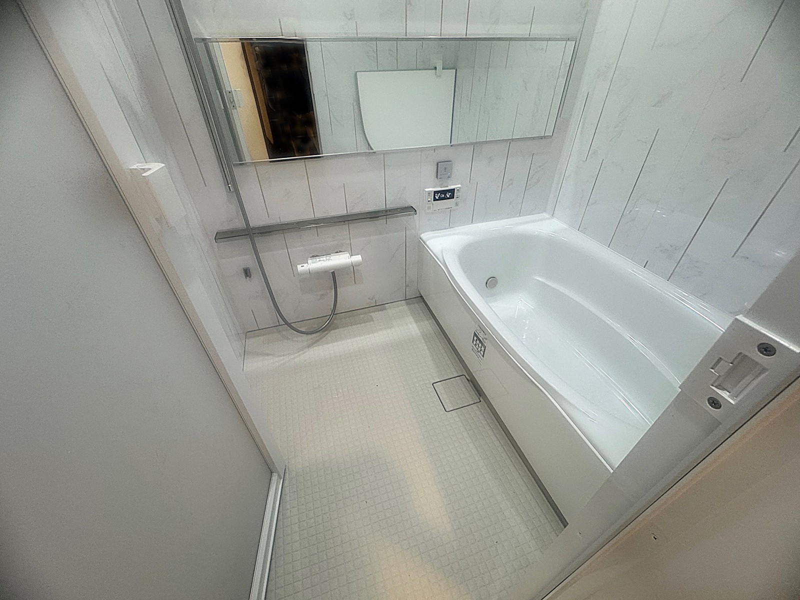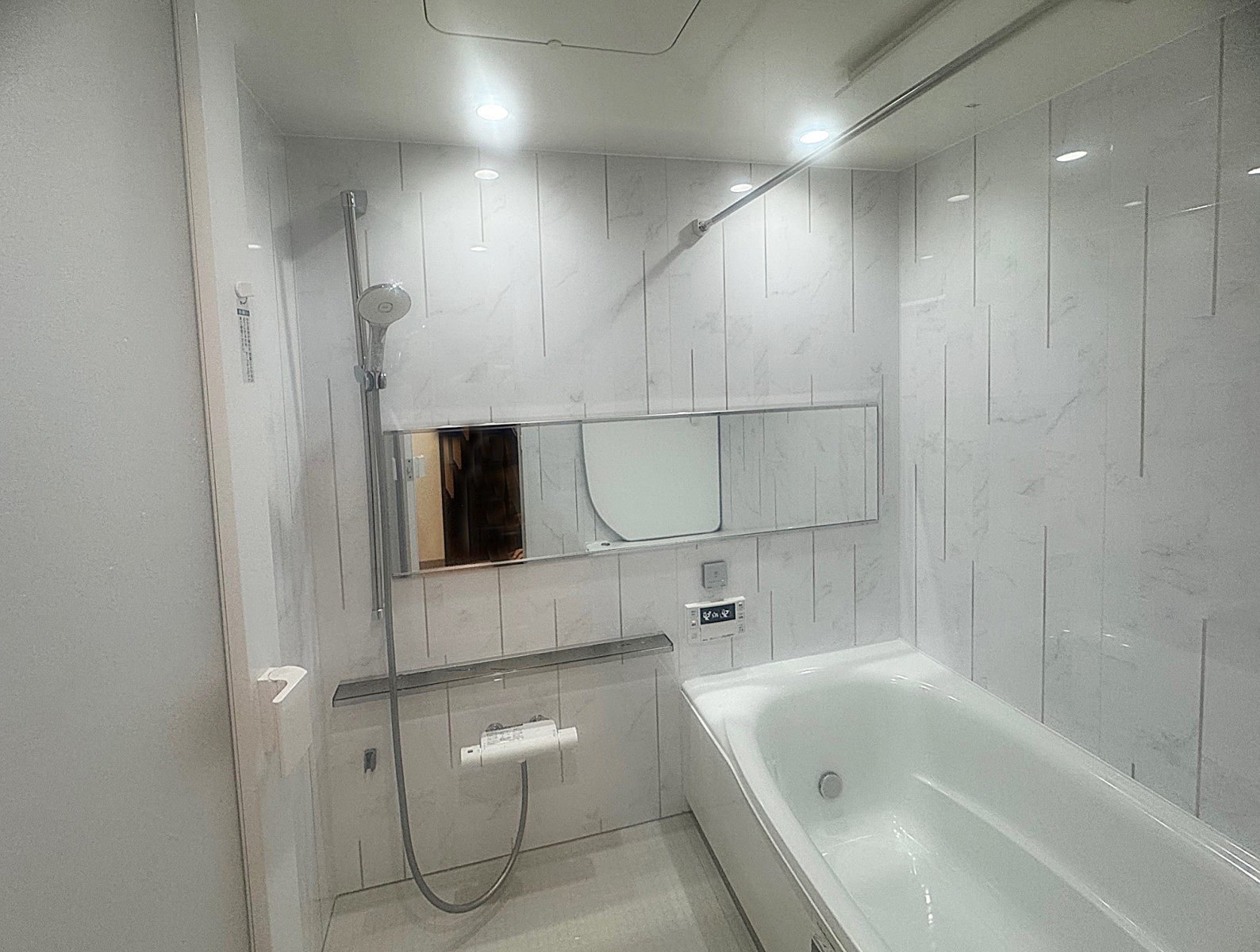 既存ユニットバス解体→給排水工事(給水・給湯・排水・アダプタ取替)→電気工事(照明・換気乾燥暖房機電源)→新規ユニットバス組立→間仕切り壁補修(ドア枠)
