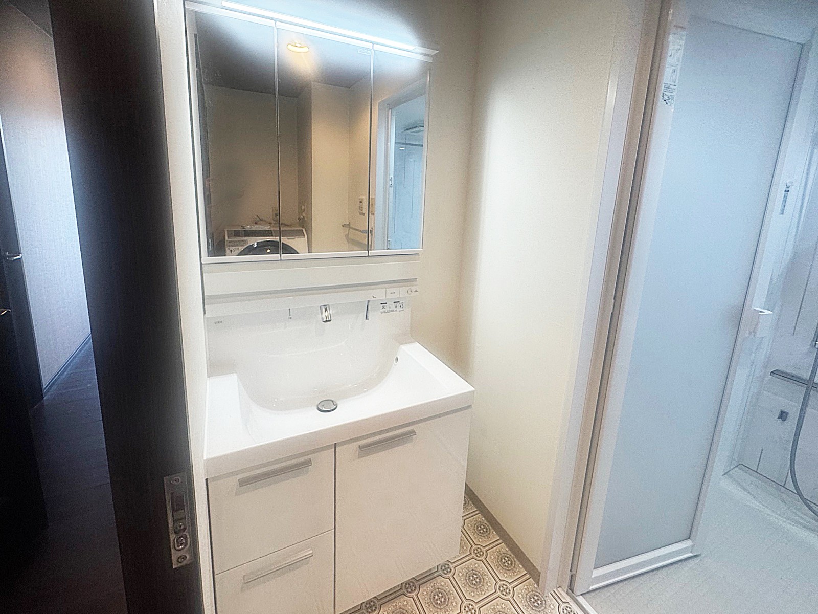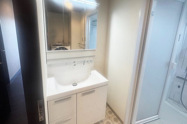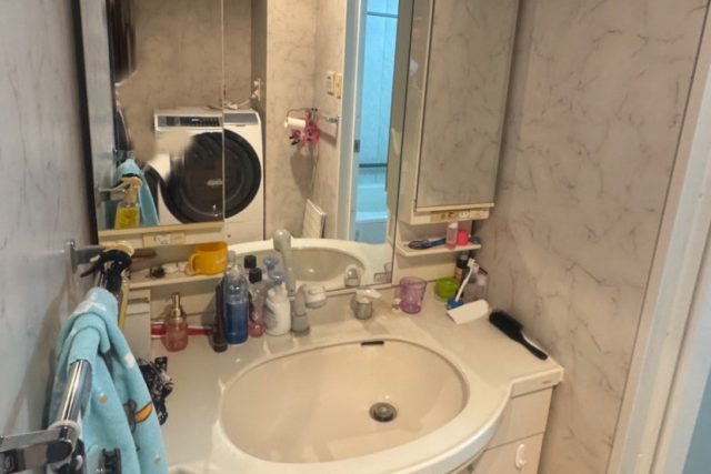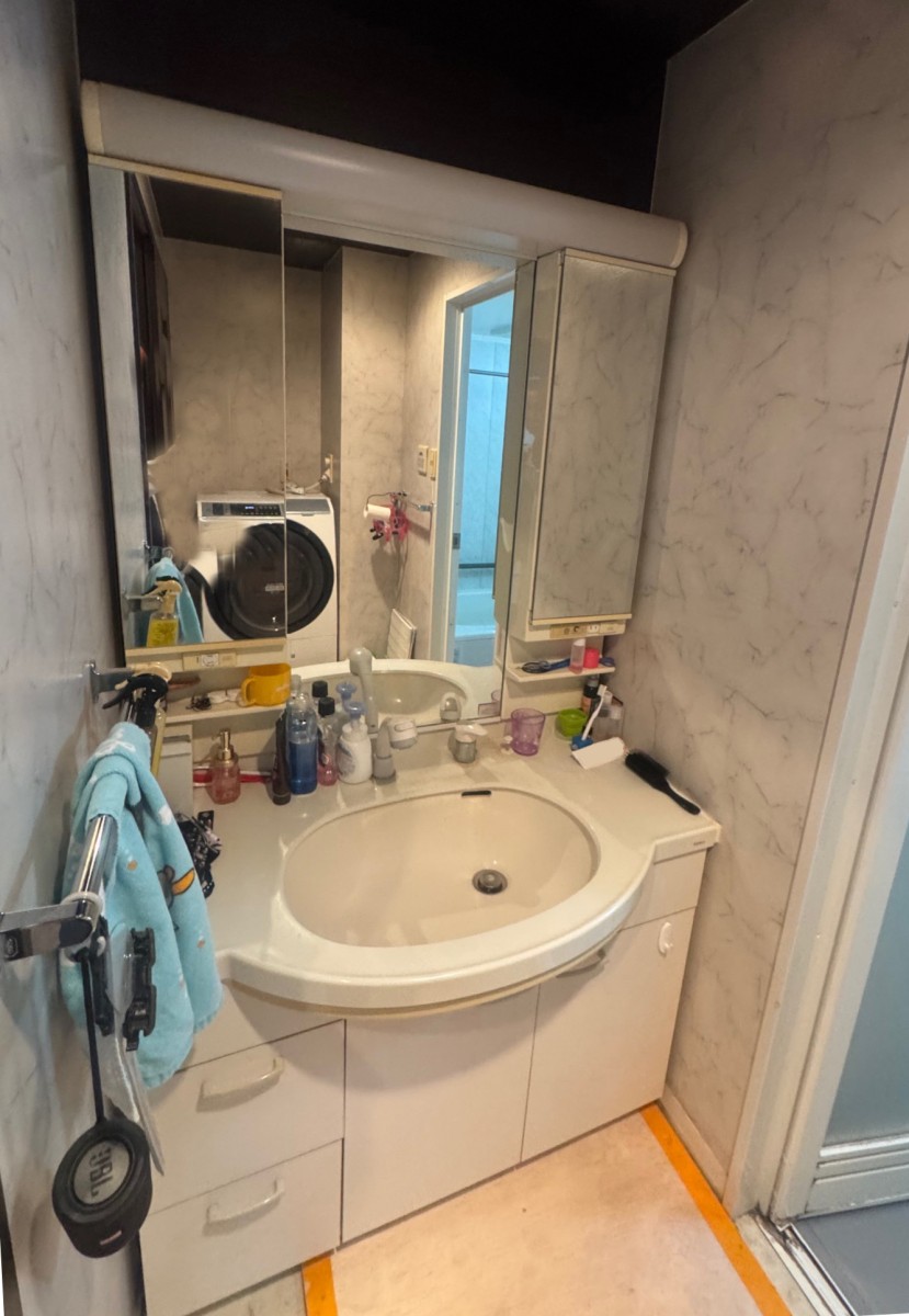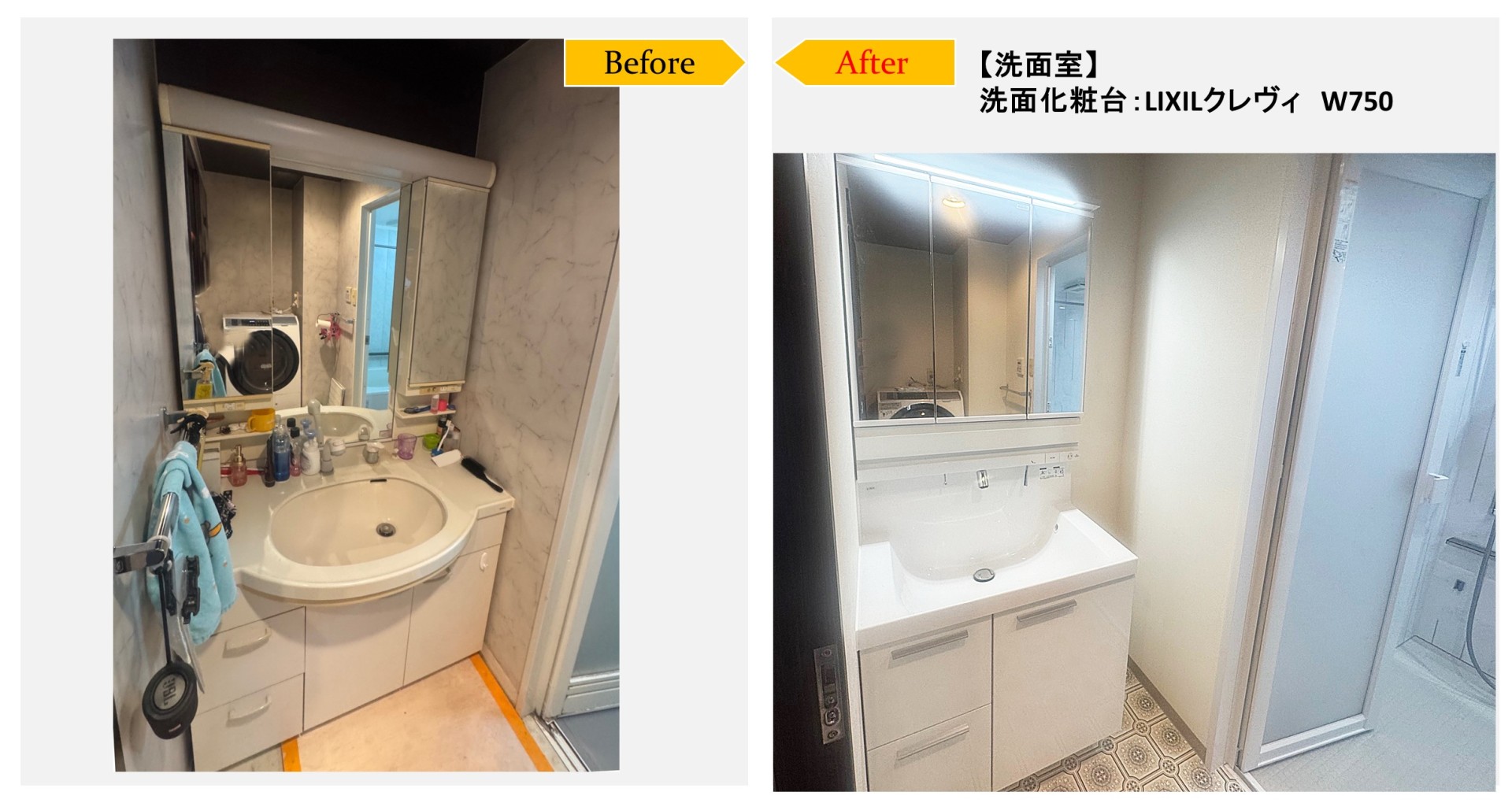 既存洗面化粧台撤去→新規洗面化粧台取付け(給排水移設含む)→洗濯機パン脱着→床下地張替え→内装工事(天井壁クロス・床クッションフロア・巾木)