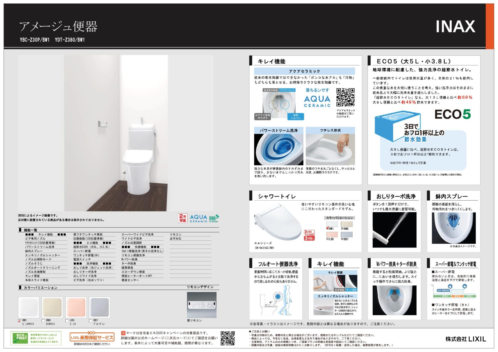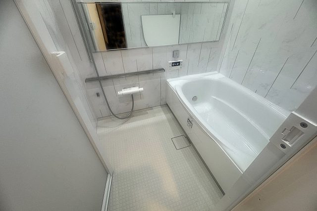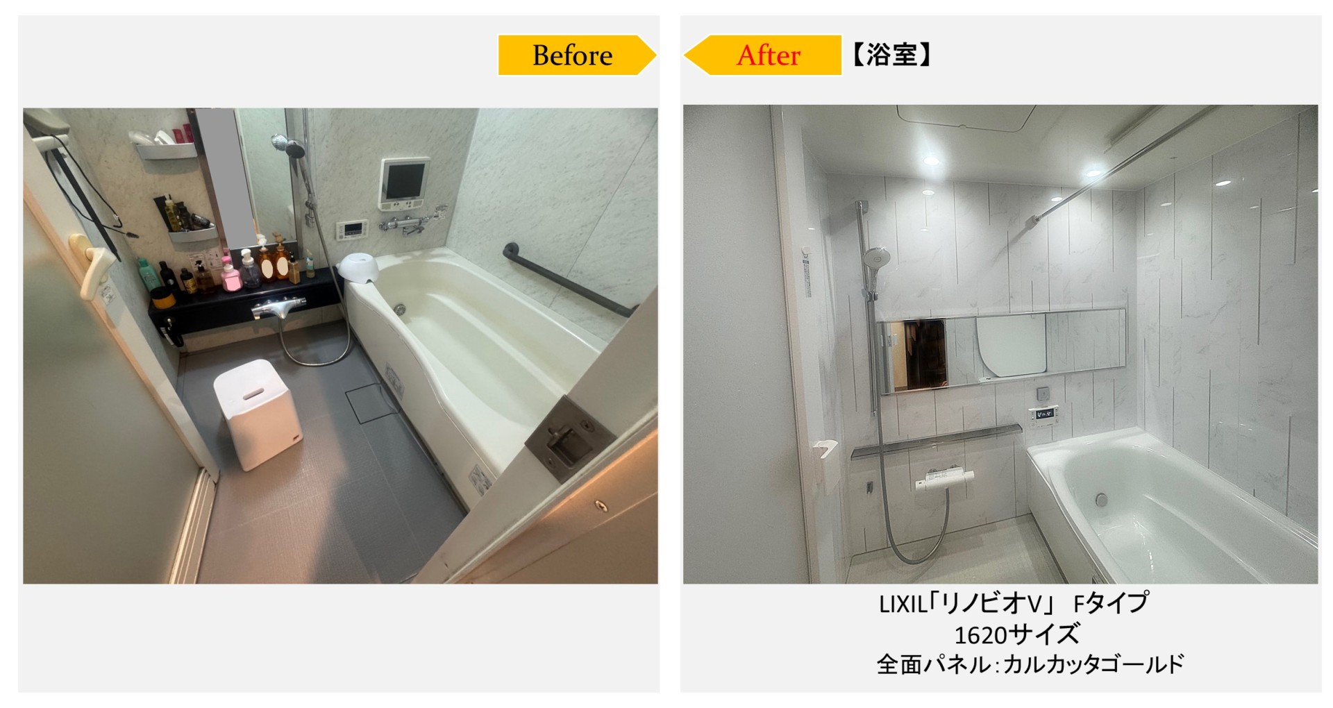 1年前にユニットバスから漏水が発生し、洗面所の床と壁にシミが出来ているのと、点検と作業時にあけた穴がそのままになっているので、洗面室クロス張替えと浴室設備交換と穴をふさぐ工事をご希望でした。浴室と洗面室リフォームの御見積をご覧頂いたあと、トイレと給湯器の取替えも追加でご依頼頂き、今回の工事になりました。浴室の全面パネル「カルカッタゴールド」は、グレーのメッシュと金色の脈が特徴的で高級感のある浴室に仕上がっています。