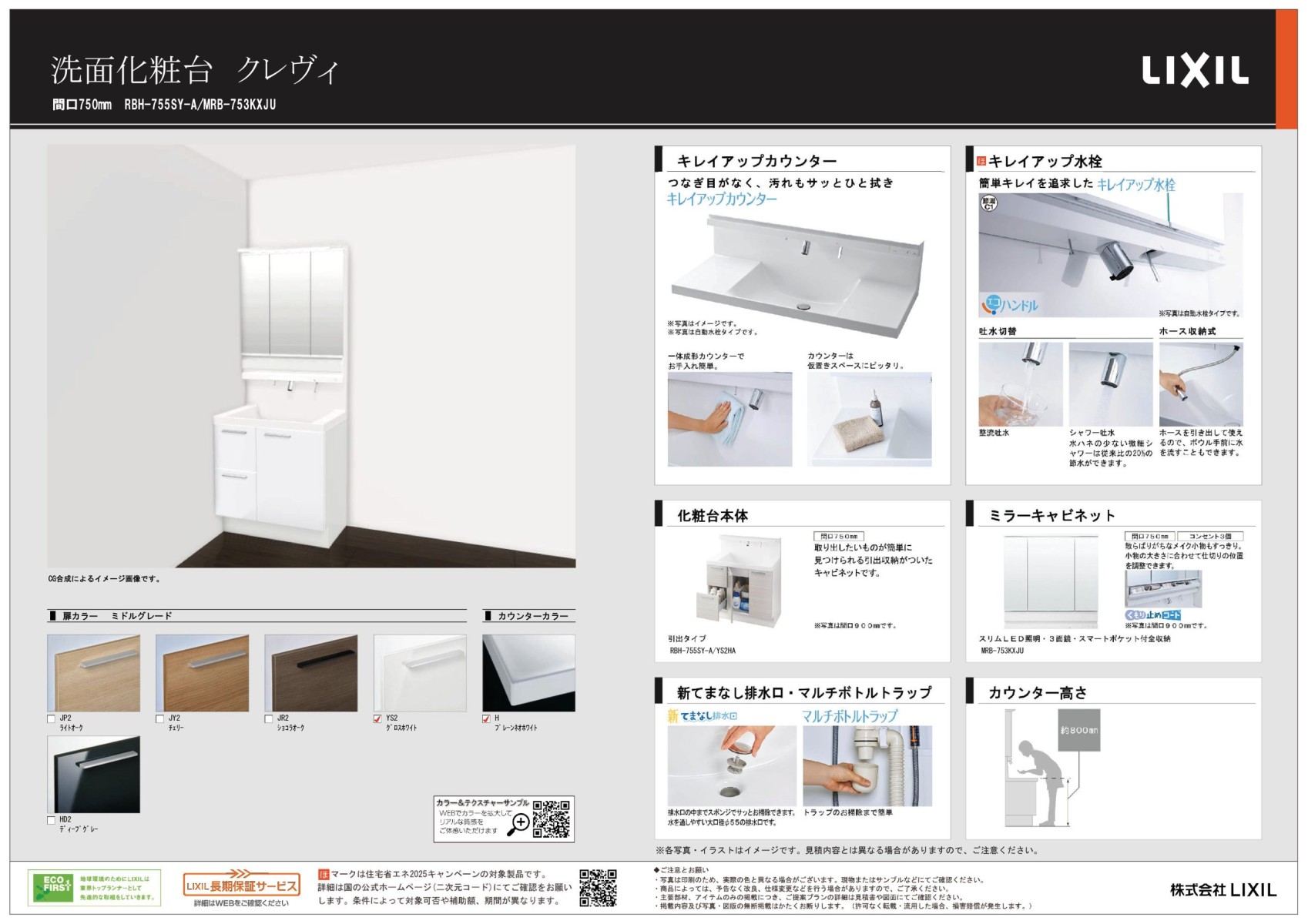 【洗面室】LIXIL:洗面化粧台クレヴィ W750