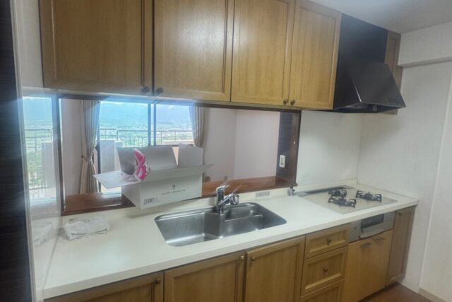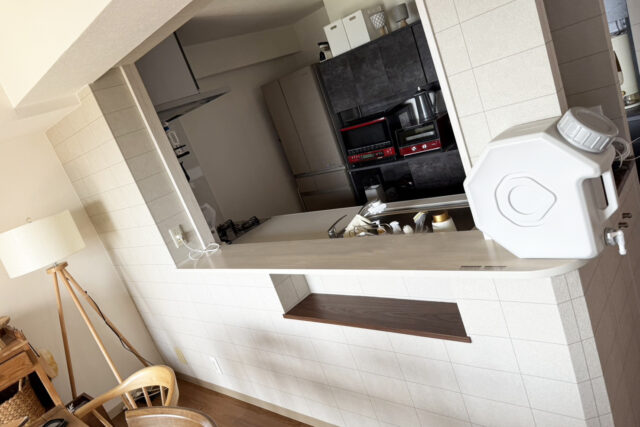 既存キッチン撤去→給排水工事(給水・給湯・排水)→ガス・電気工事(天井照明シーリング・換気扇)→キッチンパネル張り→新規キッチン組立て