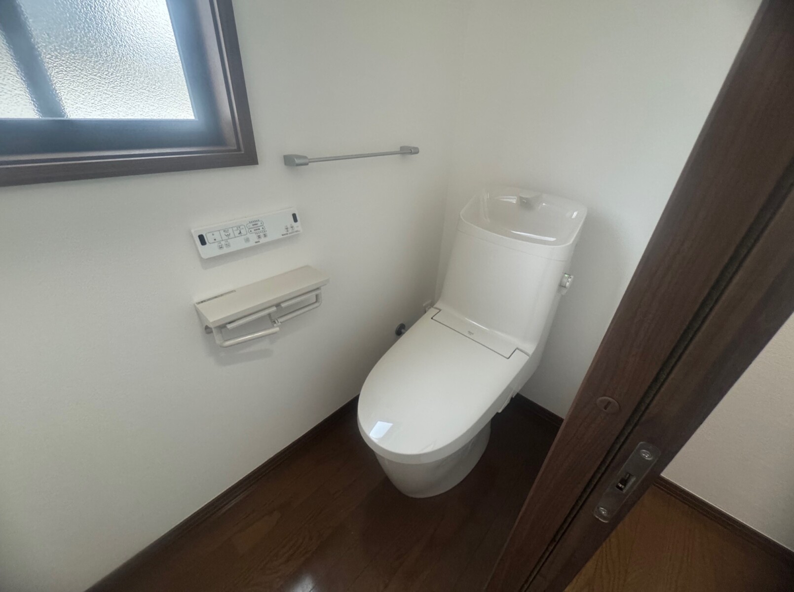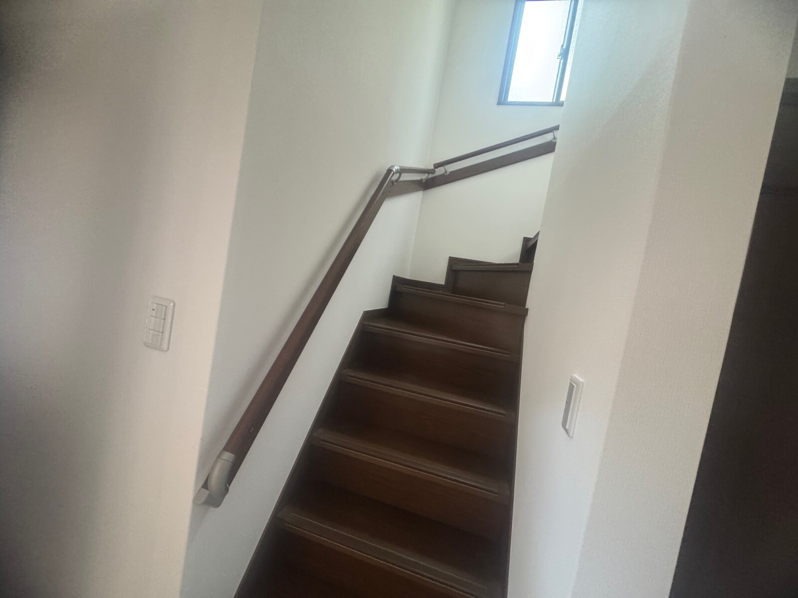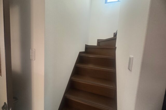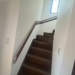 中古物件を購入しご両親と同居の予定で、2階にトイレを新設したいのと、階段に手すりを取付けたいとご相談頂きました。2階の納戸にトイレを新設のご提案では、コンパクトな一体型のシャワートイレをおススメしました。段の途中で90度に折れ曲がるかね折れ階段は、踊り場がある分、途中で落下を防ぐことができて、ストレートタイプの直階段よりは安全ですが、手すりを取付けて安全に暮らして頂ける様に施工させて頂きました。工事後、ご出張中の息子様へ完工写真をメールでご覧頂き、「写真拝見させて頂きました。とても綺麗に仕上がっててビックリです。両親も喜んでおります。」とお返事を頂きました。