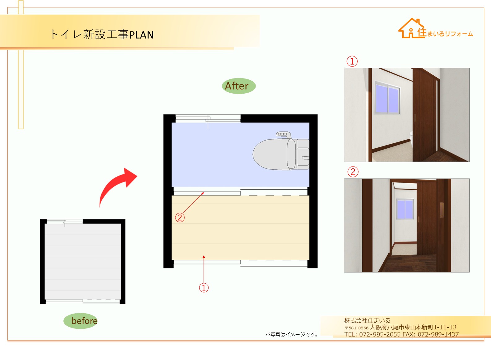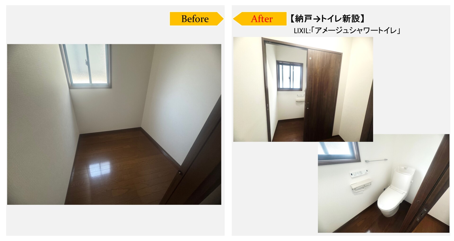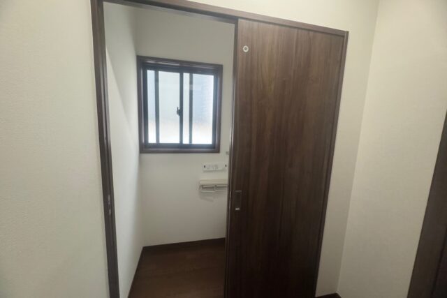 コンセント新設、換気扇新設)→間仕切り壁新設→建具取付け→新規トイレ取付け→クロス張替え