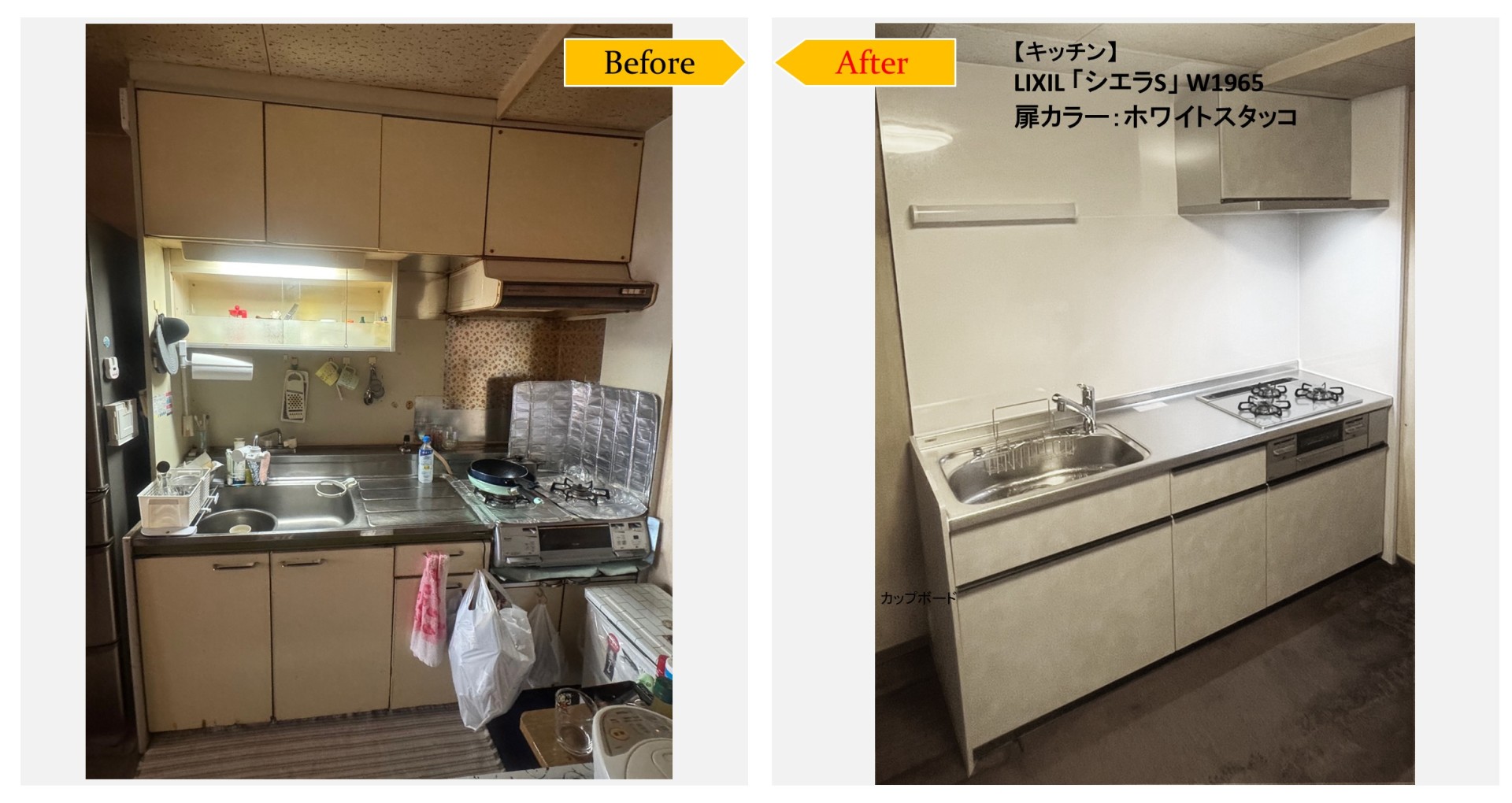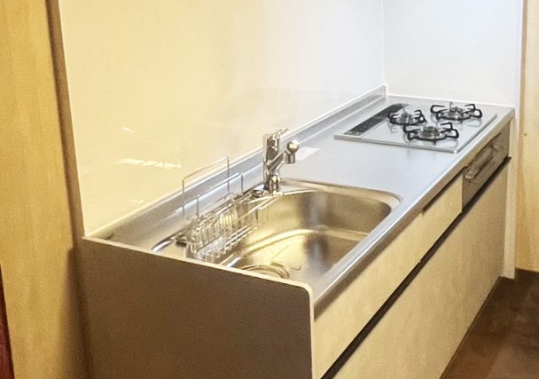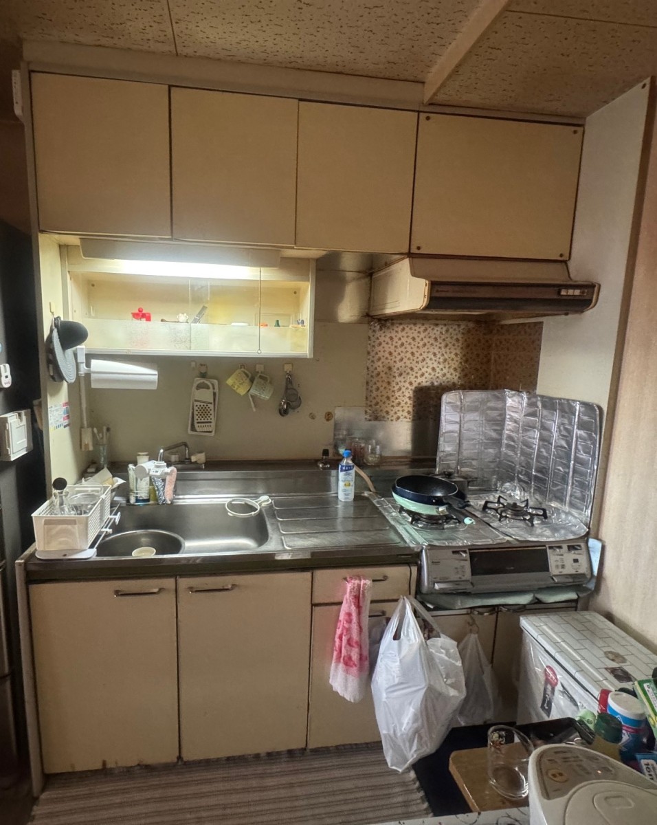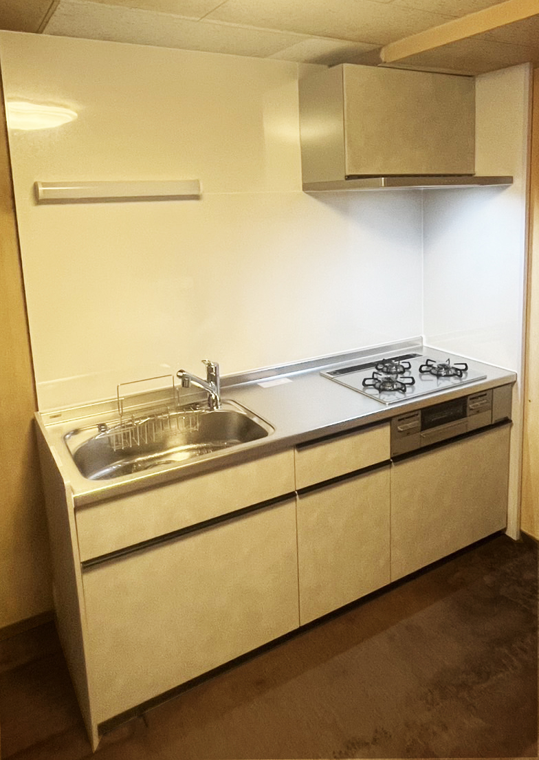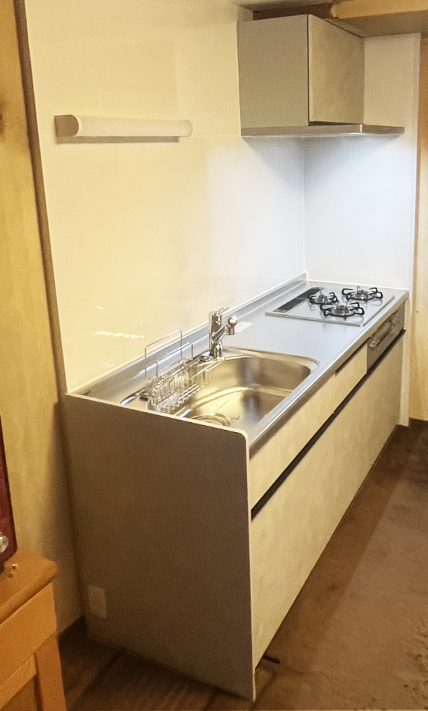 既存キッチン撤去→給排水工事(給水・給湯・排水)→ガス・電気工事(天井照明シーリング・換気扇)→キッチンパネル張り→新規キッチン組立て