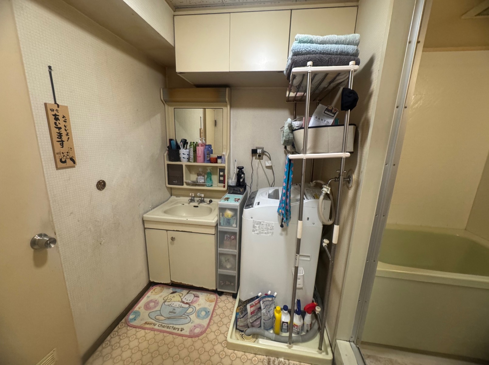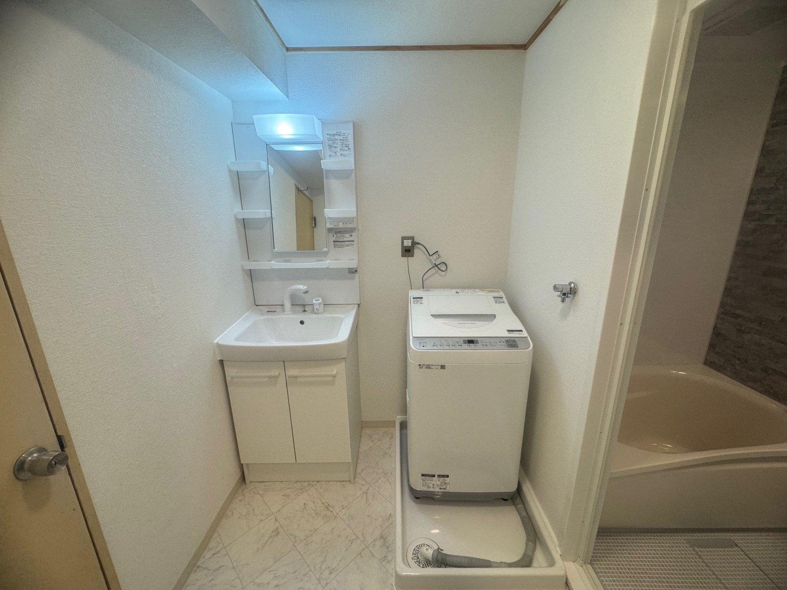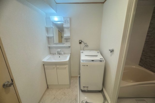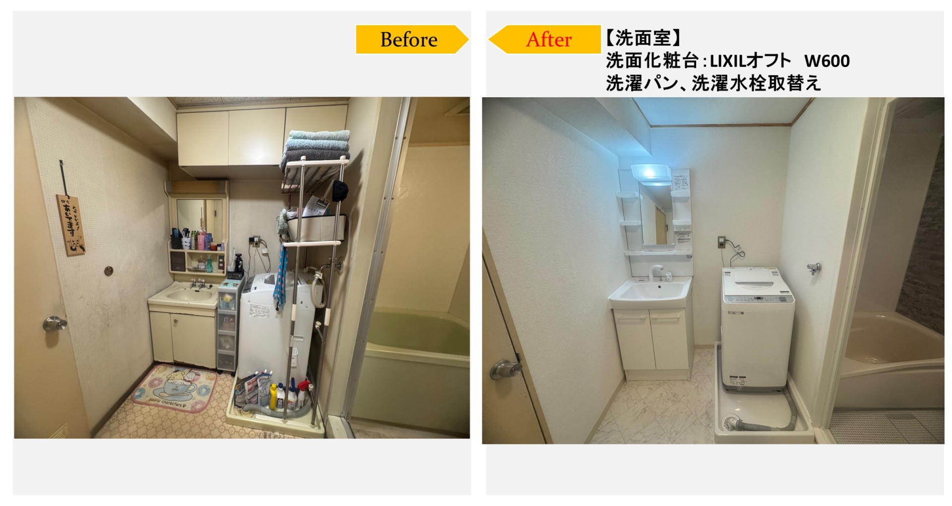 既存洗面化粧台・吊り戸撤去→新規洗面化粧台取付け→電気工事(壁照明配線)→洗濯機パン・水栓撤去→洗濯機パン・水栓新規取付け→天井下地工事→天井壁クロス張替え→床クッションフロア張替え→ソフト巾木張替え